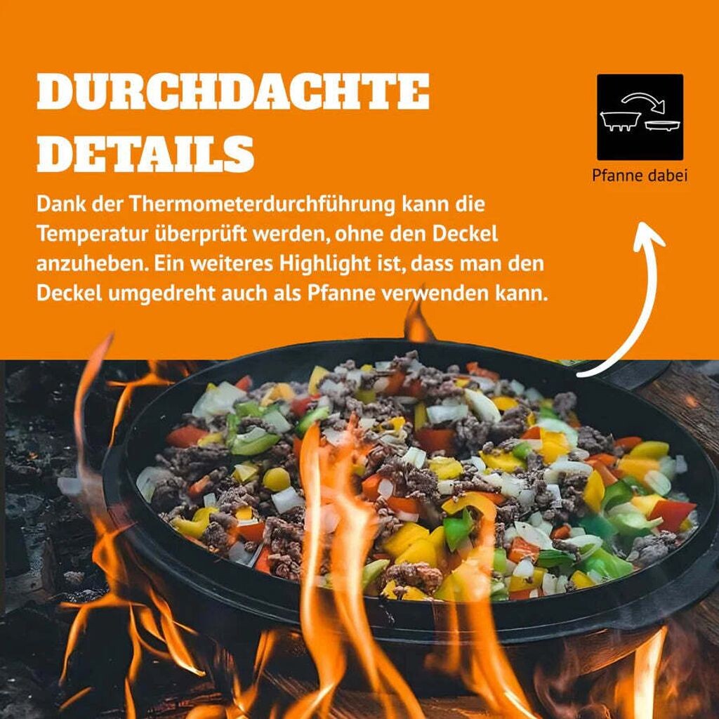 Идеальный компаньон для кемпинга, активного отдыха и отдыха. С его помощью можно готовить такие блюда, как: Б. Мясо и овощи очень нежно готовить в собственном соку на открытом огне или в духовке. Крышку жаровни можно также использовать как сервировочную тарелку или кастрюлю.