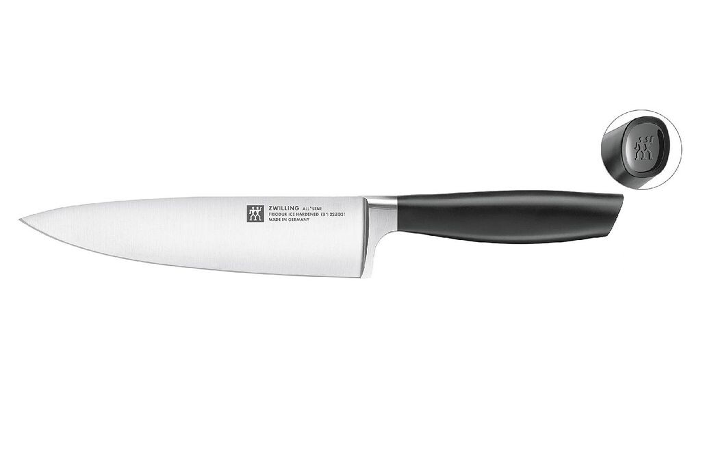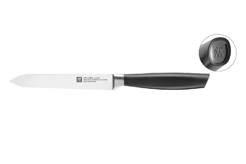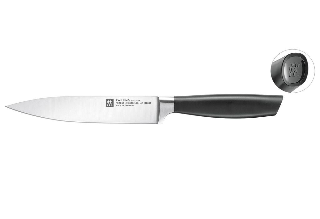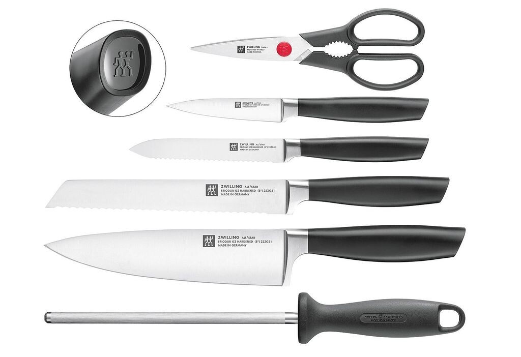 Эта дизайнерская изюминка и все, что вам нужно — внутри: набор ножей серии ZWILLING ALL*STAR предлагает идеальный базовый набор всех ножей, которые вам нужны в вашей повседневной работе на кухне. И все это в известном качестве ZWILLING, ведь в производстве этих ножей мы вложили все свои многолетние ноу-хау. Особенностью изюминки ножей является их дизайн, благодаря нанесенному логотипу высокого качества на концы рукояток. Набор ножей содержит поварской нож, нож для овощей, универсальный нож и нож для хлеба. Ножи имеют закалённое лезвие FRIODUR. Сделанные в Германии из нержавеющей стали специальной формулы ZWILLING, ножи устойчивы к коррозии и имеют высокую степень гибкости режущей кромки. Благодаря новой эргономичной рукоятке, ножи всегда удобно лежат в руке, независимо от того, какую технику резки вы используете.