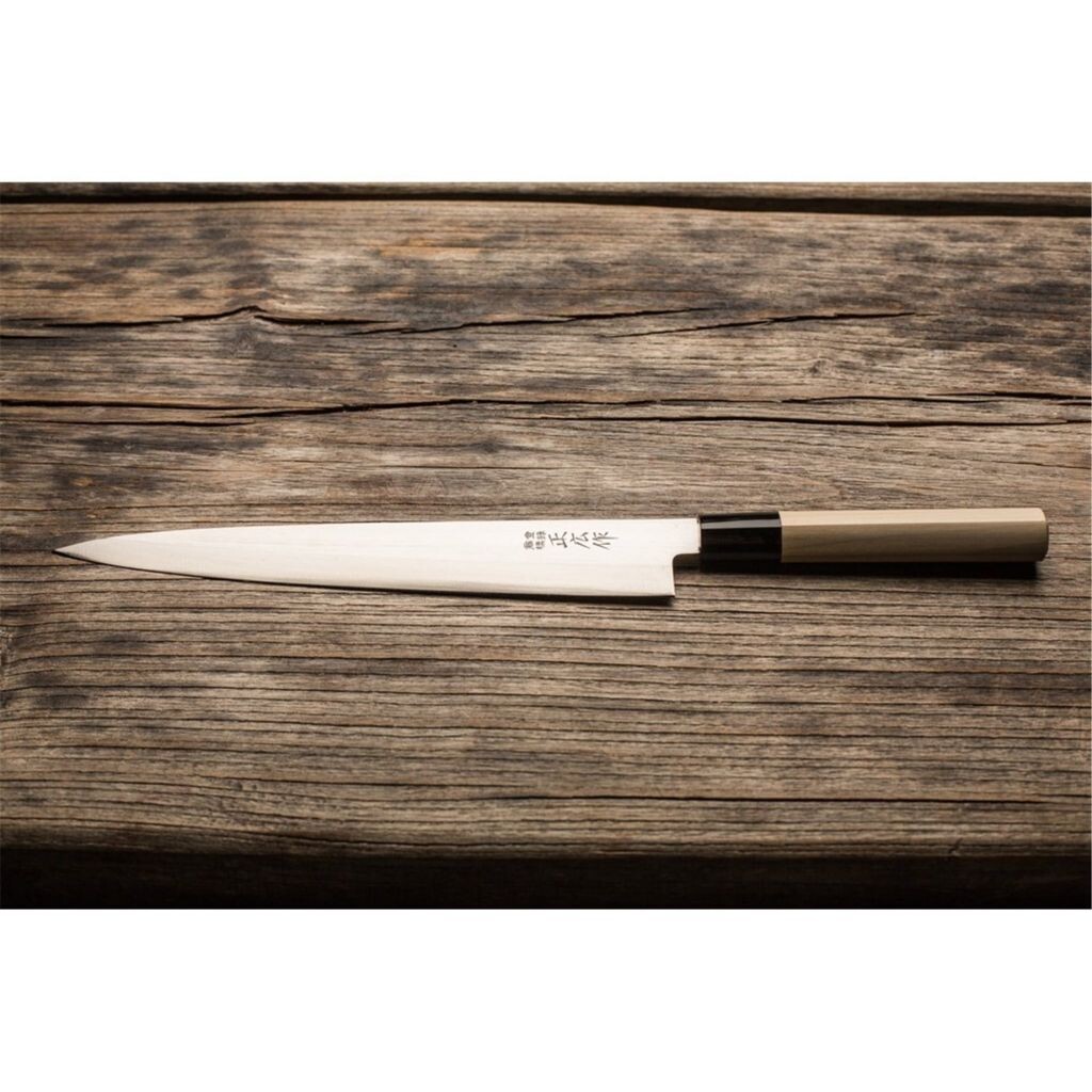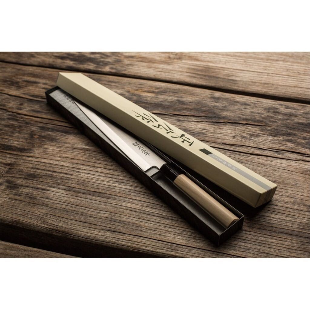 Масахиро Янагибас длиной лезвия 240 ммдля левшей – это нож, длинное и тонкое лезвие которого используется для нарезания очень тонких ломтиков или для разделки на филе. рыба . В азиатской кухне янагиба чаще всего используется для приготовления суши или сашими. Характерной чертой традиционных японских ножей является то, что они заточены с одной стороны, что позволяет точно и полностью контролировать нарезку продуктов, которые легко отрываются от ножа и обнажают красивую и блестящую режущую поверхность — важную и ценную деталь японской кухни. span>Янаги по-японски означает ива, и название ножа, скорее всего, относится к длинным и гибким ветвям этого дерева.