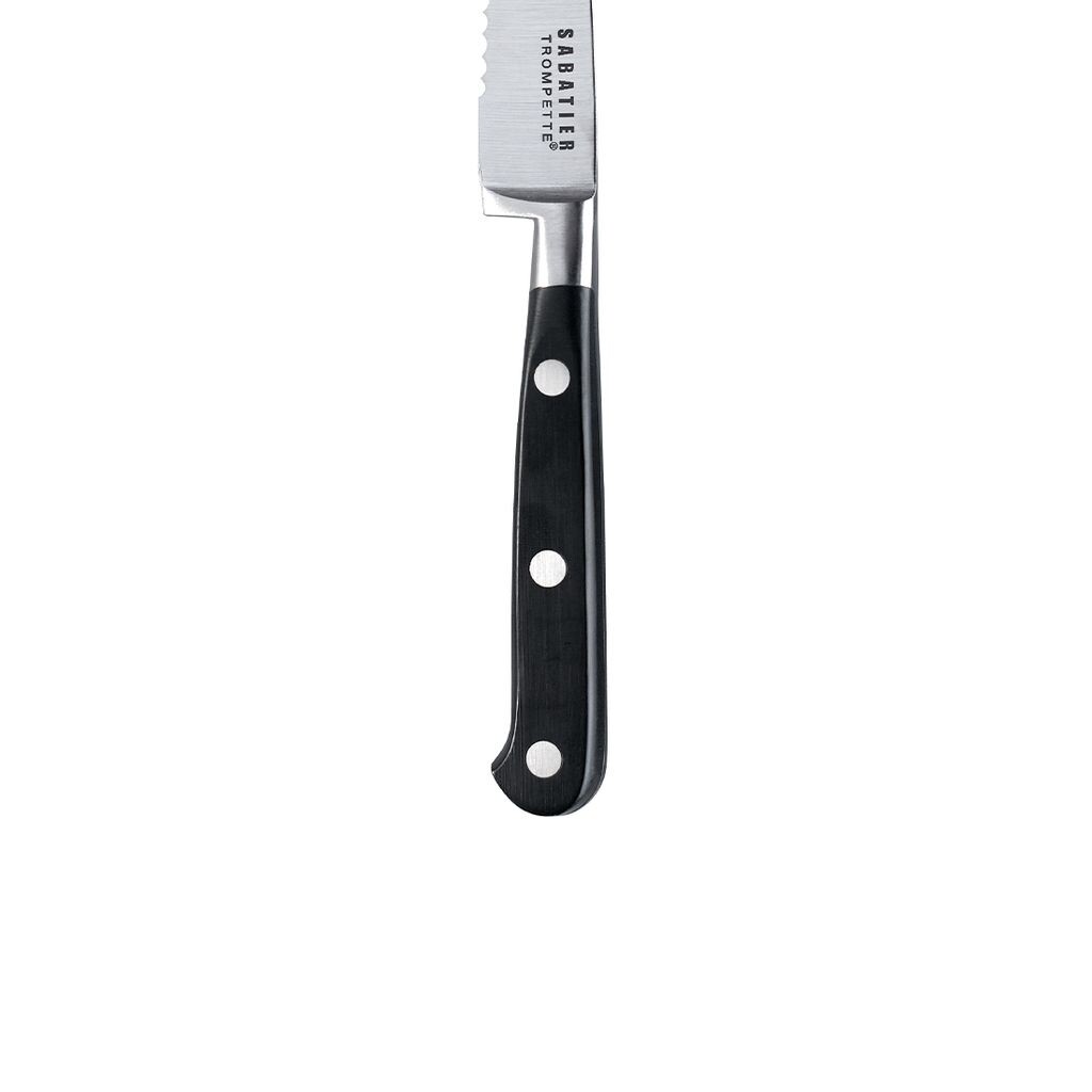 Серия Sabatier Trompette изготовлена ​​из лучшей нержавеющей стали. Лезвие обработано карбоном. Непрерывный хвостовик и чрезвычайная твердость обеспечивают стабильность и точную резку. Высококачественный поварской нож классического дизайна. Лезвие из нержавеющей стали с карбоновым сплошным лезвием для удобной резки. В комплекте: 6 ножей для стейков из стали MoV, ABS. Можно мыть в посудомоечной машине. 6 частей.