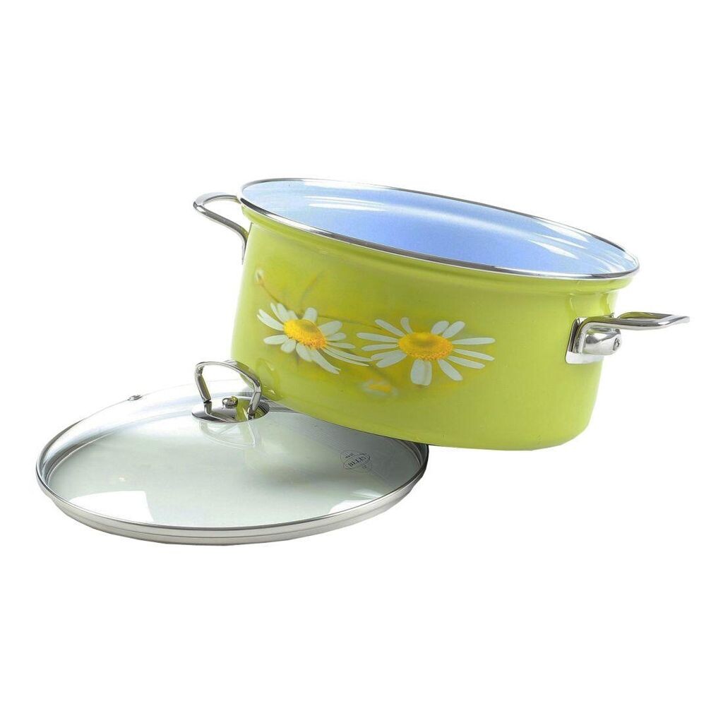 Эмалированная кастрюля с ручками из нержавеющей стали емкостью 1,4 л из набора DAISY и цветочным декором может использоваться на любой кухне и подходит для подходят для всех типов печей. Кастрюля поставляется со стеклянной крышкой.