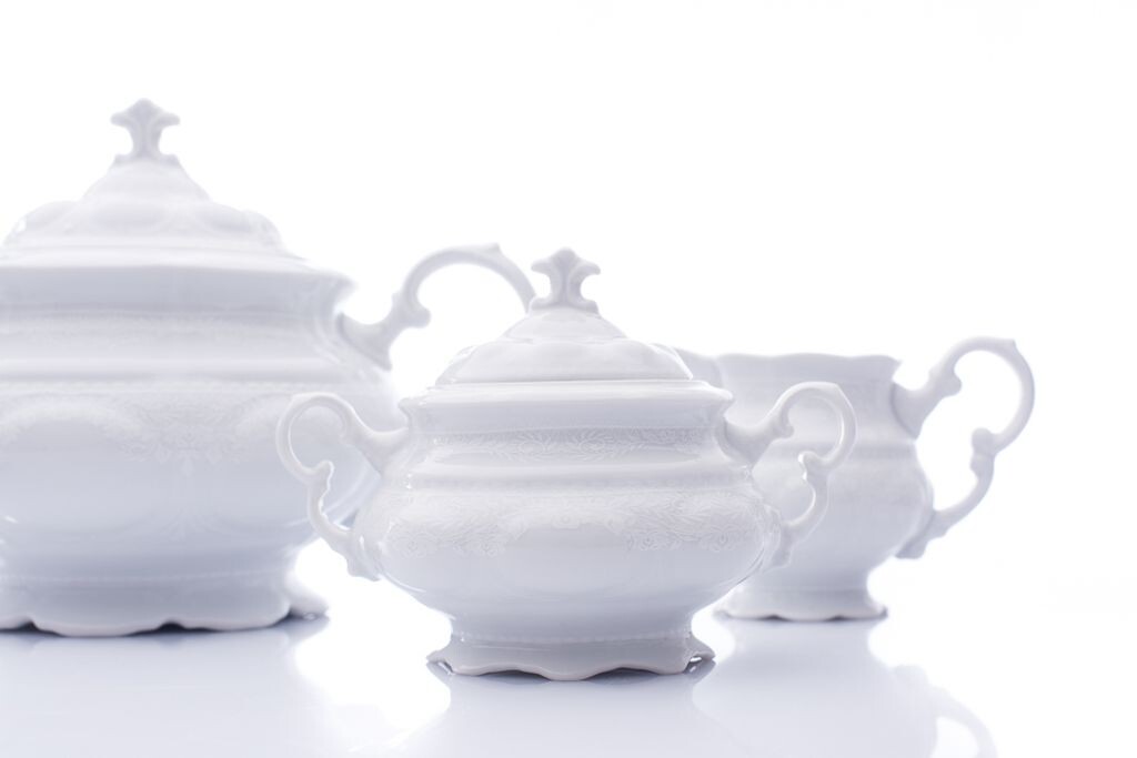 Чайный сервиз Соната из белого фарфора. Декор – белое кружево. Качественный карловарский фарфор от Leander Состав набора: - чайник 1,10 л - 1 шт. - чашка и блюдце 0,20 л - 6 шт. - молочник 0,20 л - 1 шт. - сахарница 0,20 л - 1 шт. Набор предназначен для обоих. Подходит для посудомоечной машины и микроволновой печи.