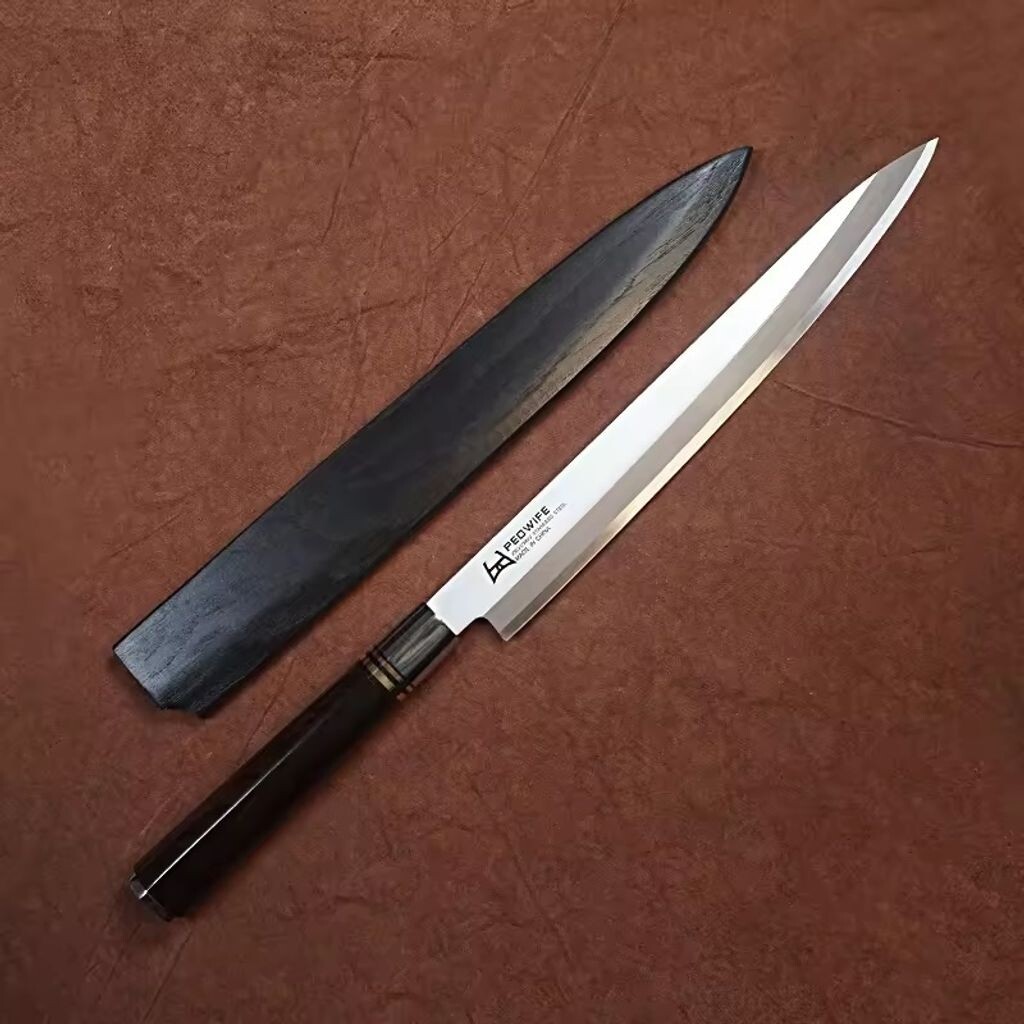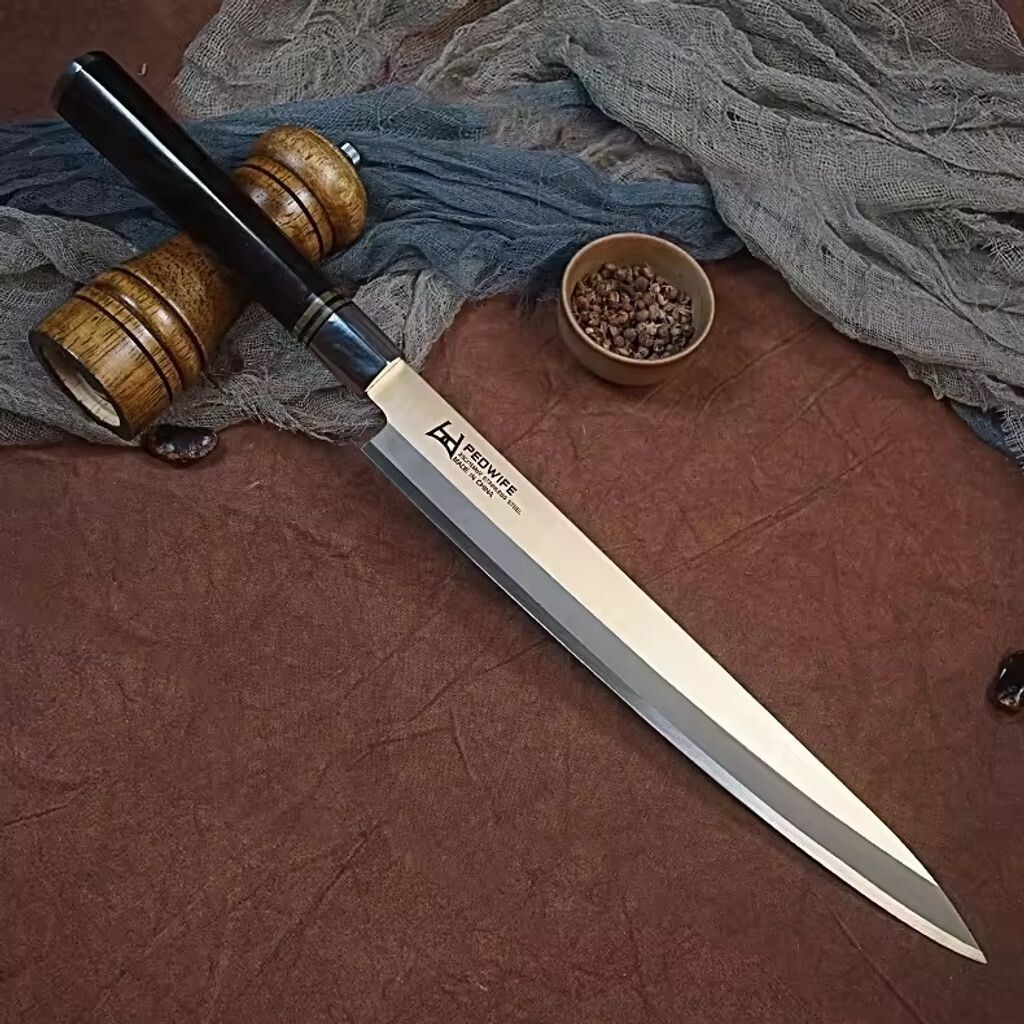 ШЕДЕВР Кухонный нож Нацу Кухонный нож Нацу изготовлен из высококачественной высокоуглеродистой нержавеющей стали и станет идеальным подарком для любого хобби или профессионального повара. Нож имеет твердость 60 – 62 HRC (Роквелла) и отличается стойкостью к истиранию и высокой стабильностью лезвия. Рукоять выполнена из черного эбена, имеет форму, обеспечивающую надежный и удобный хват, и прекрасно дополняет дизайн всего ножа. Нож поставляется в деревянном чехле. Он имеет высокую твердость и острые края, что обеспечивает максимальную производительность и долговечность резки, а также позволяет использовать его в различных целях для нарезки овощей и мяса. Этот нож отличается чрезвычайно острым лезвием, отличной износостойкостью и устойчивостью к пятнам и ржавчине. Мы рекомендуем мыть, сушить и убирать нож сразу после использования. НЕ СТАВЬТЕ НОЖ В ПОСУДОМОЕЧНУЮ МАШИНУ!!! Спецификация: Материал лезвия: 5Cr15MoV Материал ручки: черное дерево Твердость: HRC60–62 Цвет: серебро с черной ручкой Очень удобно лежит в руке. Не использовать для замороженных продуктов. Упаковка: 1 нож, 1 футляр. Корпус: дерево. Длина: 40 см. Длина лезвия: 25 см. Толщина лезвия: 4 мм. Вес: 560 г.