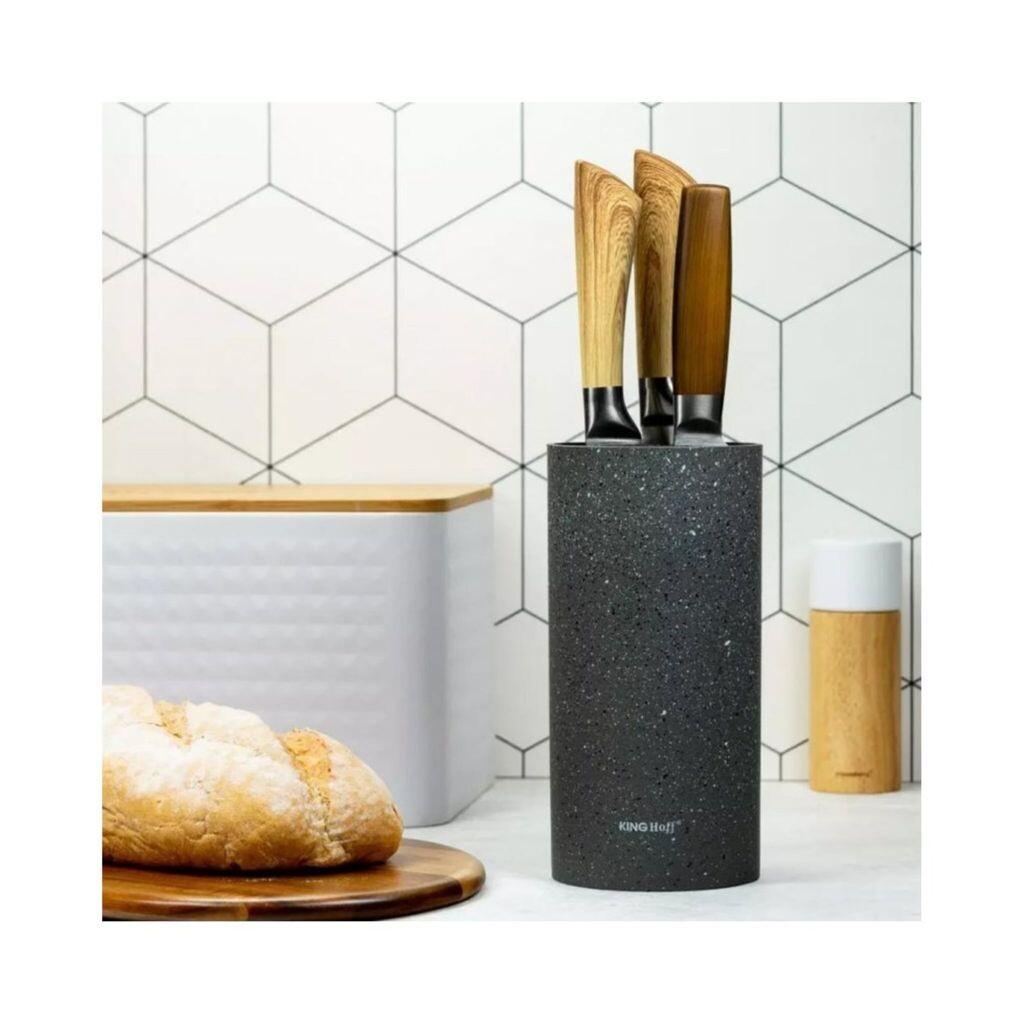 Универсальный держатель ножей KINGHOFF с полипропиленовой вставкойиз акрила с силиконовым покрытием. Современный и простой дизайн идеально впишется в интерьер вашей кухни и гарантирует, что ваши ножи всегда будут под рукой. Внутри подставки имеется полипропиленовая вставка с резьбой, позволяющая хранить ножи любой длины и ширины при условии, что они помещаются в подставку.