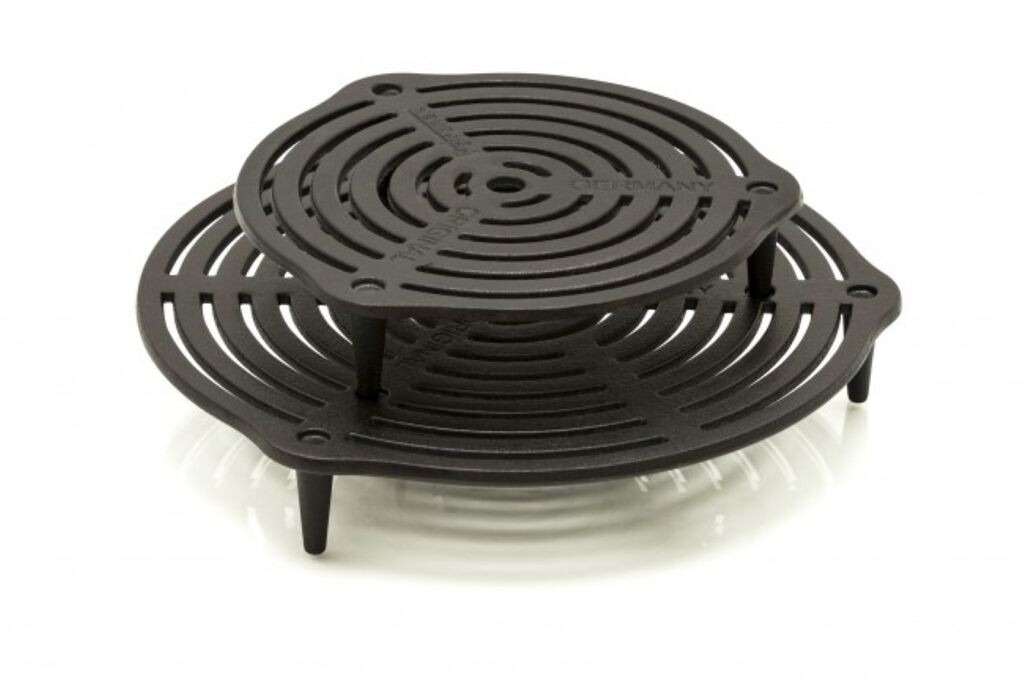 Штабелируемая решетка из цельного чугуна обеспечивает первоклассное распределение тепла – идеальное решение для выпечки. Приготовление на пару и приготовление на пару на нескольких уровнях в жаровне. Поскольку вставка стоит на трех ножках, которые создают идеальное расстояние от дна кастрюли, вы можете готовить мясо, овощи и выпечку, не пригорая. Благодаря выдержанному послевкусию эту решетку можно использовать сразу же, без необходимости ее приправы.
