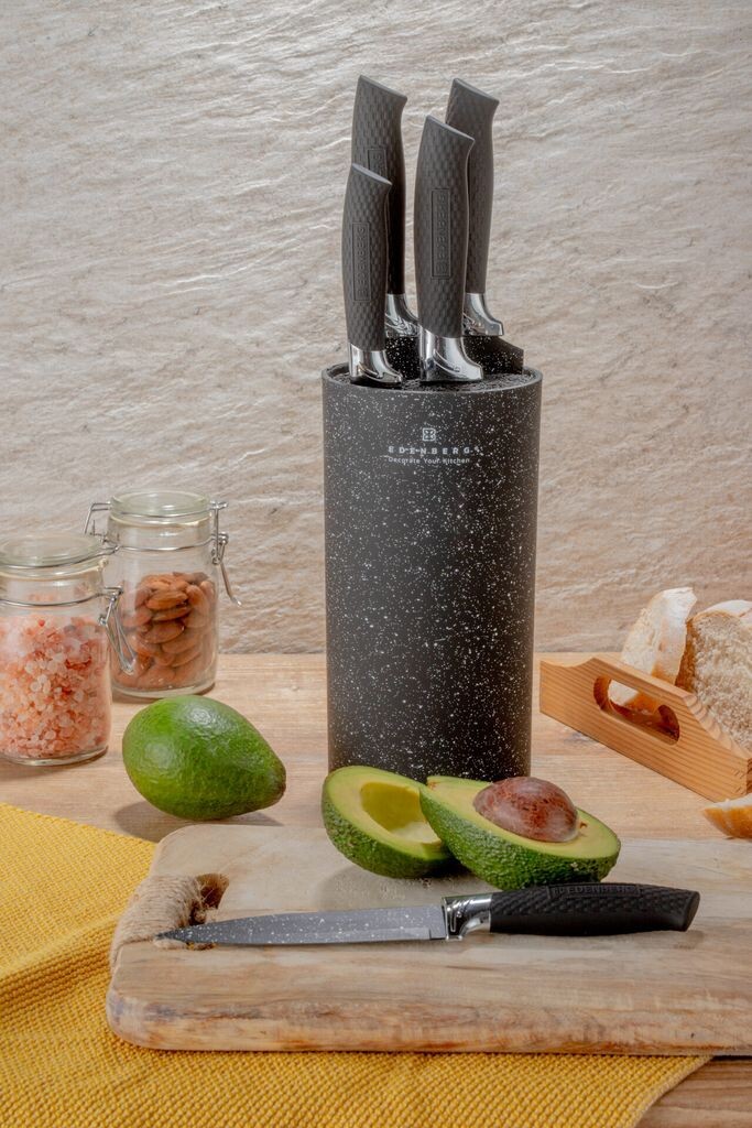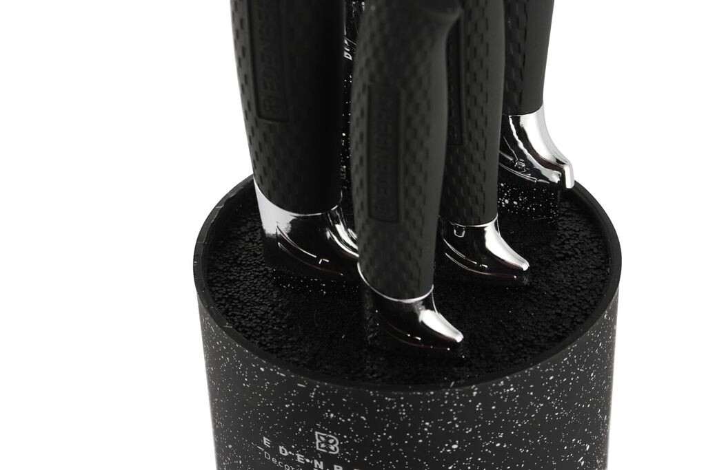Набор ножей от EDENBERG . Ножи изготовлены из нержавеющей стали высочайшего качества, покрыты примесью керамики, заточены лазером. Гораздо более устойчивы к повреждениям, чем цельнокерамические ножи. Керамическое покрытие не вступает в реакцию с веществами и витаминами, содержащимися в фруктах и овощах, сохраняя их пищевую ценность и вкус. Нарезанные продукты не прилипают к ножам, что облегчает нарезку.