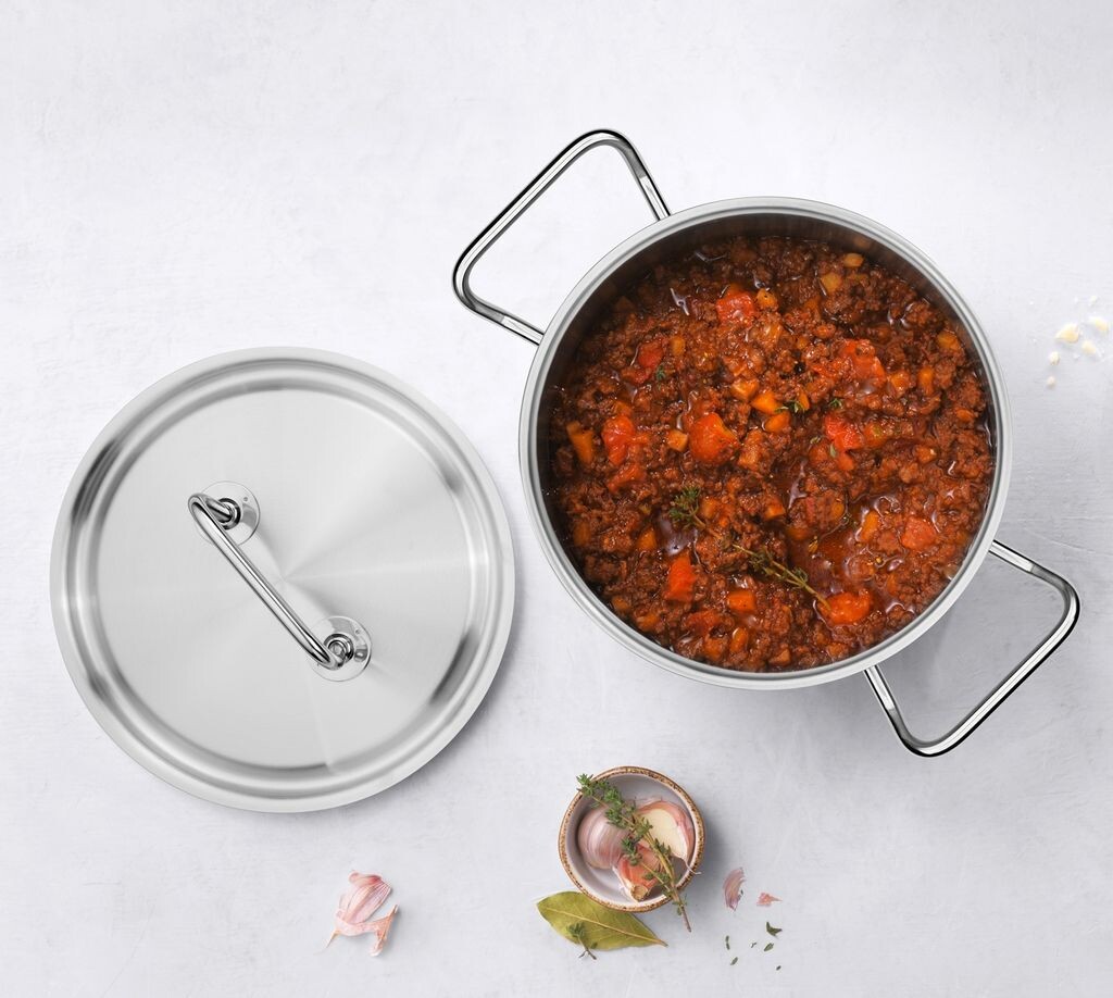 Кастрюля имеет диаметр 28 см и плотно закрывающуюся крышку, что позволяет готовить с минимальным использованием воды. Подходит для любого типа плиты, включая индукционные плиты и духовку. Его ручки остаются приятно прохладными во время использования, а загнутый край что предотвращает капание, помогает при наливании. Встроенная шкала наполнения также удобна и упрощает дозировку жидкостей.