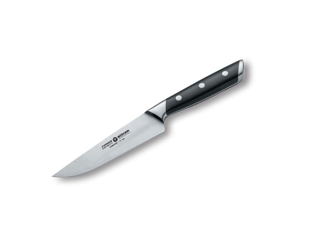 Конструкция лезвий, включая переход на больстер, позволяет легко затачивать ножи и в сочетании с правильным уходом гарантирует безупречную работу ножей в течение длительного времени. Пожалуйста, мойте ножи только вручную, а не в посудомоечной машине. Кроме того, серия Böker Forge впечатляет чрезвычайно привлекательным соотношением цены и качества. Ножи поставляются в качественной подарочной упаковке. . Универсальный нож, или универсальный нож, представляет собой очень удобную смесь поварского ножа и ножа для очистки овощей. Чаще всего универсальный нож на кухне используется для обработки фруктов и овощей, которые можно использовать как для очистки, так и для нарезки. Но и более мелкие кусочки рыбы и мяса также можно легко нарезать с его помощью. Поскольку нож, заточенный с обеих сторон, используется очень часто, без него не обходится ни одна кухня.