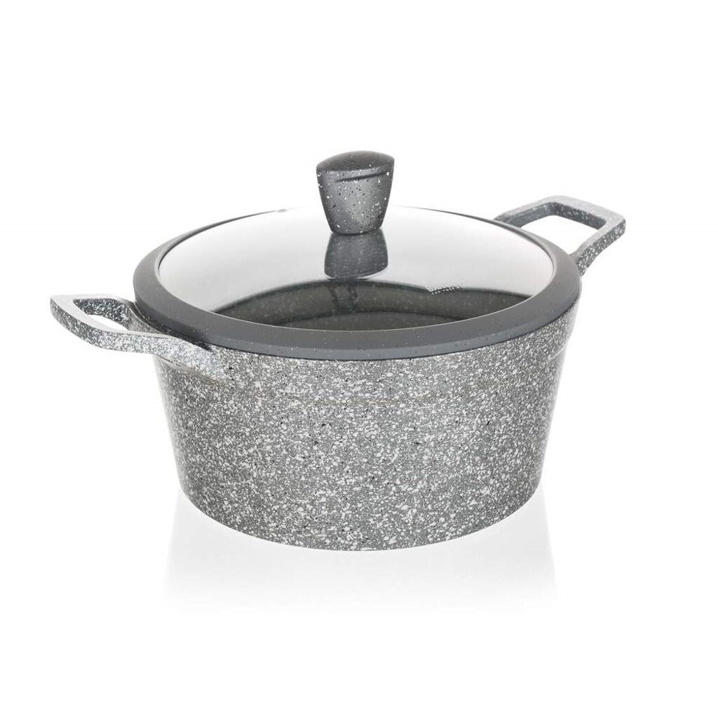 Литая алюминиевая жаровня MARRONE диаметром 28 см со стеклянной крышкой, оснащенной ручкой с силиконовой поверхностью. Кастрюля имеет антипригарную поверхность и предназначена для повседневного приготовления пищи. Индукционная база полностью покрыта термостойким гранитным покрытием. Кастрюля подходит для всех типов плит, включая индукционные.