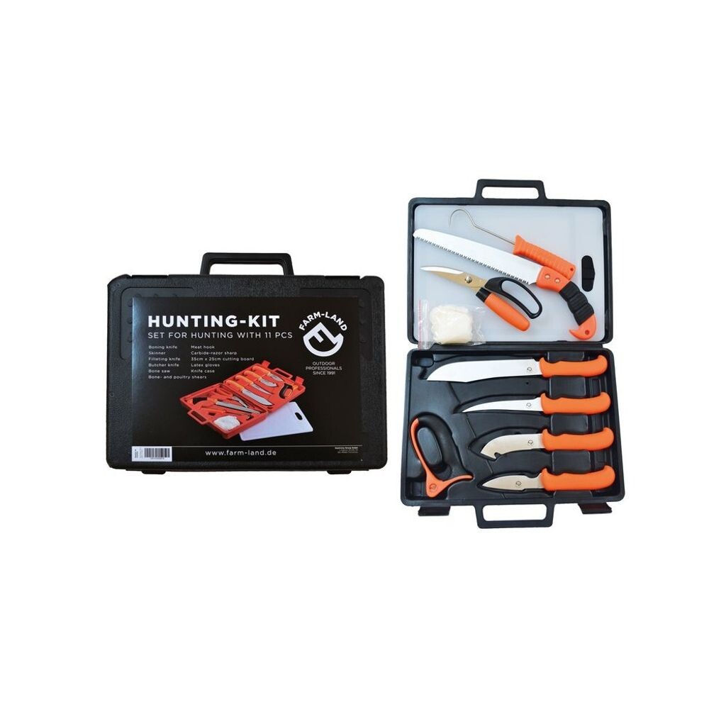 Набор ножей Hunting Kit из 11 предметовИндивидуальность и функциональность являются предпосылками для профессиональной разделки и подготовки дичи.Hunting KIT сочетает в себе два принципа:Высококачественные лезвия Изготовлены из нержавеющей стали 420, а ручки эргономичной формы из нескользящего кратона обеспечивают идеальное положение рук и идеальный разрез.Содержимое:Нож для обвалки, устройство для снятия шкур, нож для филе, нож для разделки мяса, пила для костей, кость и ножницы для птицы, крючок для мяса, твердосплавная точилка для ножей, разделочная доска 35x25 см, латексные перчатки, чемодан.