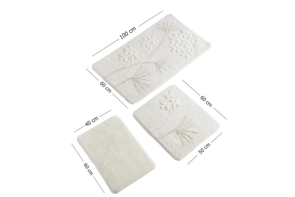 - Элегантный дизайн:Комплект выполнен в вечном экрю-цвете, который придаст вашей ванной комнате элегантную и изысканную атмосферу. Нейтральные цвета легко вписываются в любой стиль интерьера. Технические данные:Материал: 100% акрил, высота ворса: 25 мм, вес: 1450 г/м², нескользящее дно, машинная стирка при 30 °C, ручная работа. Размеры ковриков для ванной: 40 х 60 см (1 шт.), 50 х 60 см (1 шт.), 60 х 100 см (1 шт.).