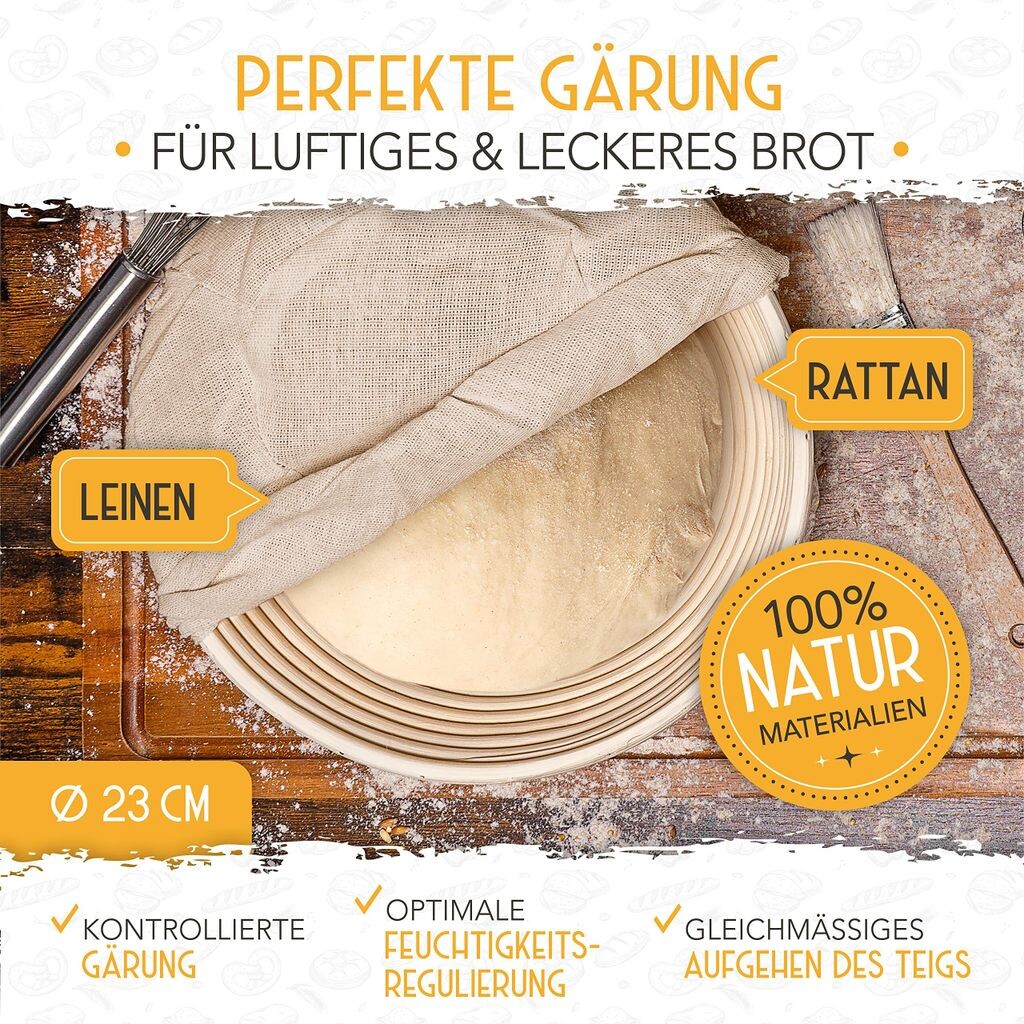 НАСТОЯЩИЙ ОПЫТ ВЫПЕЧКИ. Погрузитесь в кулинарное ремесло и создайте свой хлеб совершенно индивидуально. Набор из 2 корзин для брожения и 2 ножей для надрезки теста поможет вам, будь то багет, цельнозерновое тесто или тесто на закваске. льняную ткань и получить идеальную консистенцию. Каждая корзина для расстойки изготовлена ​​из натурального ротанга.