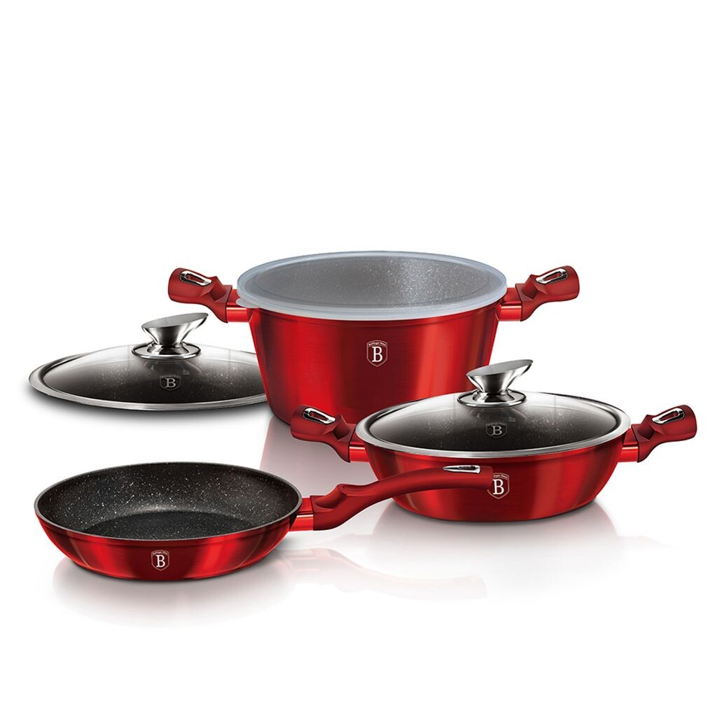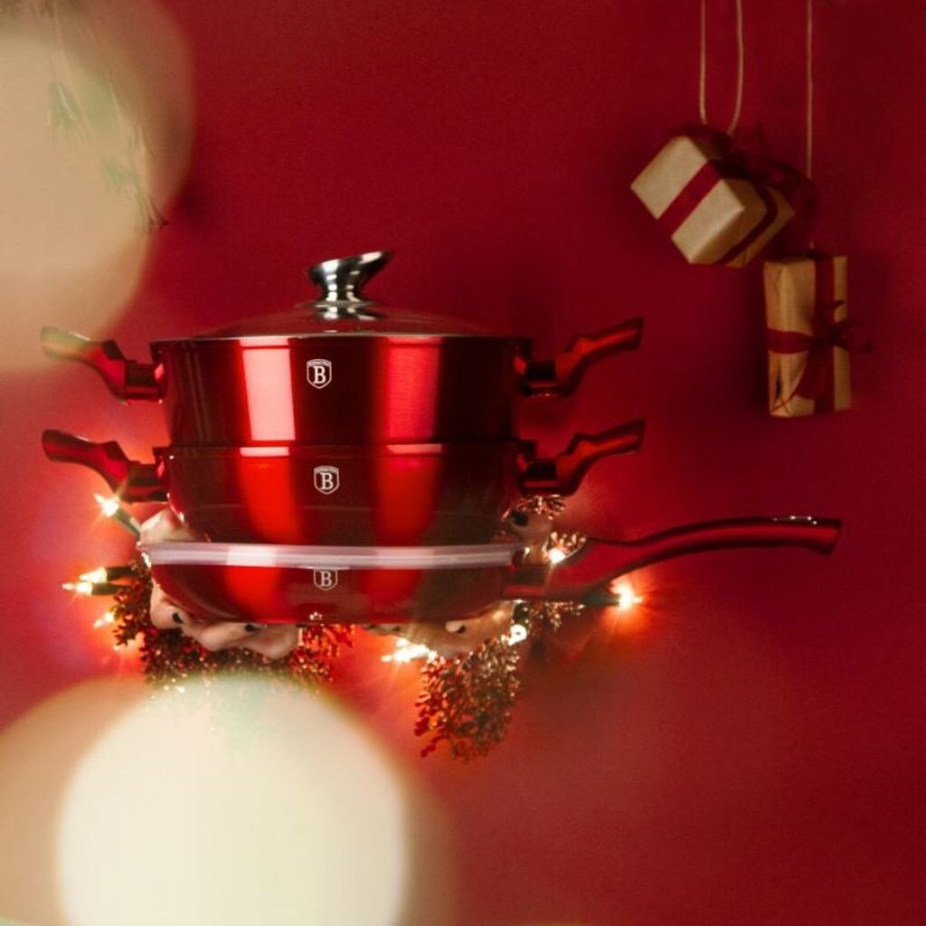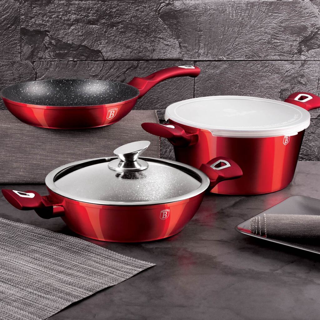 Набор кастрюль БОРДОВЫЙ что-то для всех, кто любит сочетание функциональности и эстетики в повседневных предметах. Набор состоит из красной сковороды, двух красных кастрюль и двух одинаковых крышек. Посуда изготовлена из прочных и прочных материалов. а яркий цвет с металлическим блеском отлично смотрится на кухонной стойке. Назначение