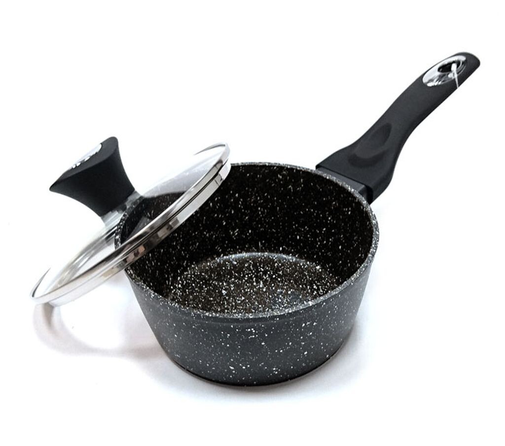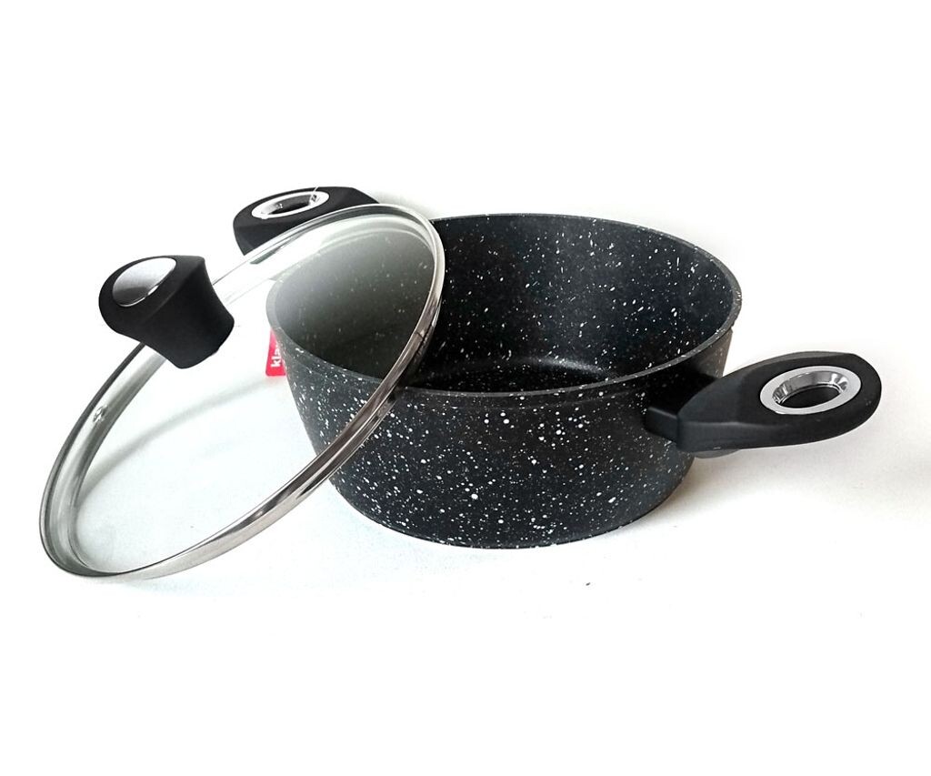 Гранитное покрытие делает посуду чрезвычайно устойчивой к царапинам и долговечной. Этот тип кастрюль и сковородок также позволяет жарить с минимумом жира, так как посуда нагревается подобно каменной и излучает тепло по всей поверхности.