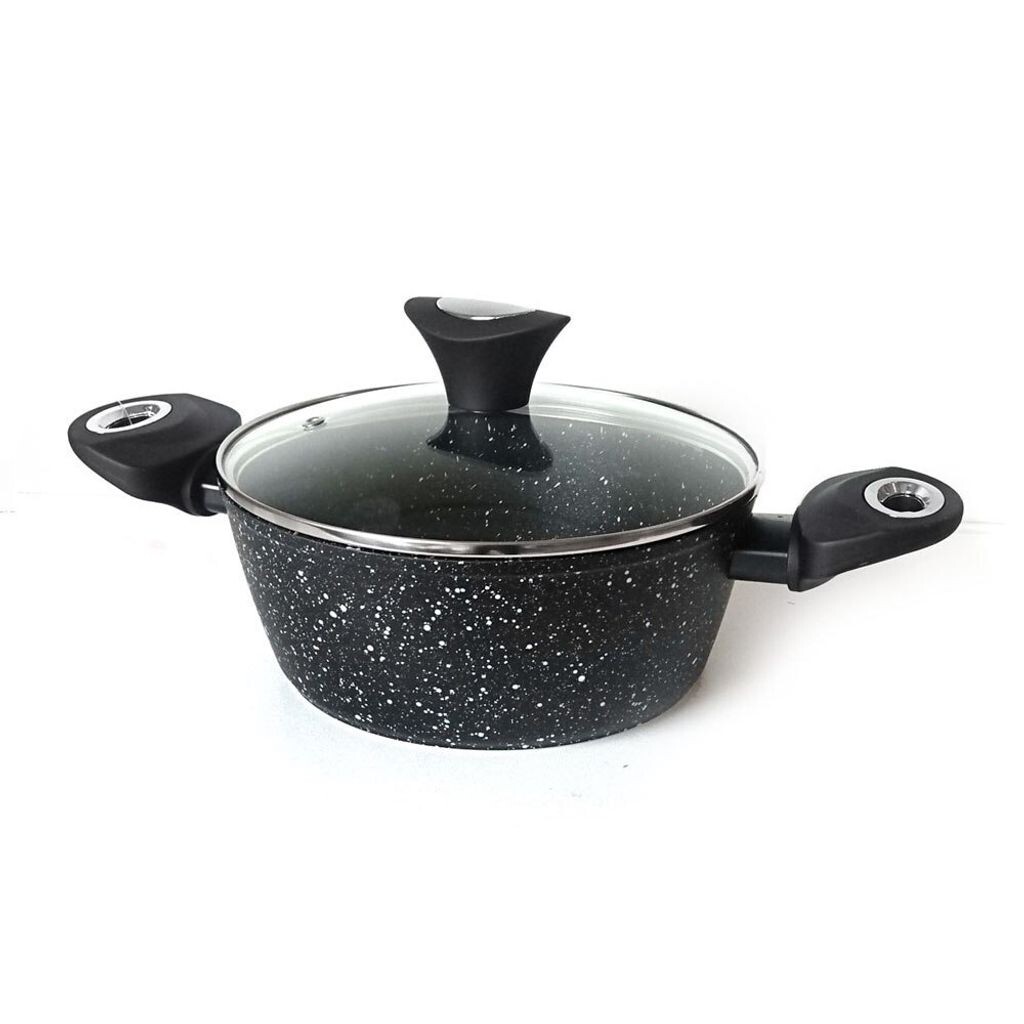Антипригарное гранитное покрытие обогащено гранитным порошком, что придает ему большую твердость. Он тверже тефлона, но сохраняет свои преимущества: не горит и хорошо распределяет тепло. Она сочетает в себе преимущества чугунной и тефлоновой посуды. Оно обладает всеми преимуществами тефлона, но более устойчиво к повреждениям и даже превосходит керамические покрытия. На таком типе кастрюль и сковородок можно также жарить с минимальным количеством жира, так как посуда нагревается как камень и отдает тепло по всей поверхности.