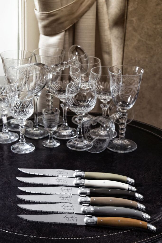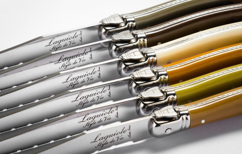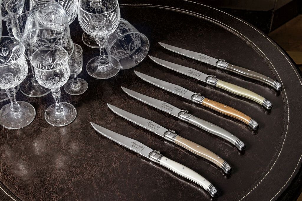 Ножи для стейка Laguiole Style de Vie Premium Line Treasure, 6 штук Ножи для стейка премиум-класса Laguiole Style de Vie незаменимы в доме. Ножи для стейка очень функциональны и помогают, помимо прочего, легко нарезать мясо. Благодаря практичному блоку ножи для стейка можно хранить в удобном месте и всегда иметь под рукой. Ножи для стейка Laguiole имеют красивую ручку и поэтому очень удобны на столе. Ножи для стейка Laguiole также доступны в следующих цветах: Нержавеющая сталь Черный Жемчуг Розовый Фиолетовый Синий Медь Павлин Разве это не именно то, что вы ищете? Тогда взгляните на всю коллекцию Premium Line или просмотрите весь ассортимент бренда Laguiole Style de Vie. Существует несколько производителей ножей Laguiole. но вся продукция Style de Vie имеет сертификат подлинности.