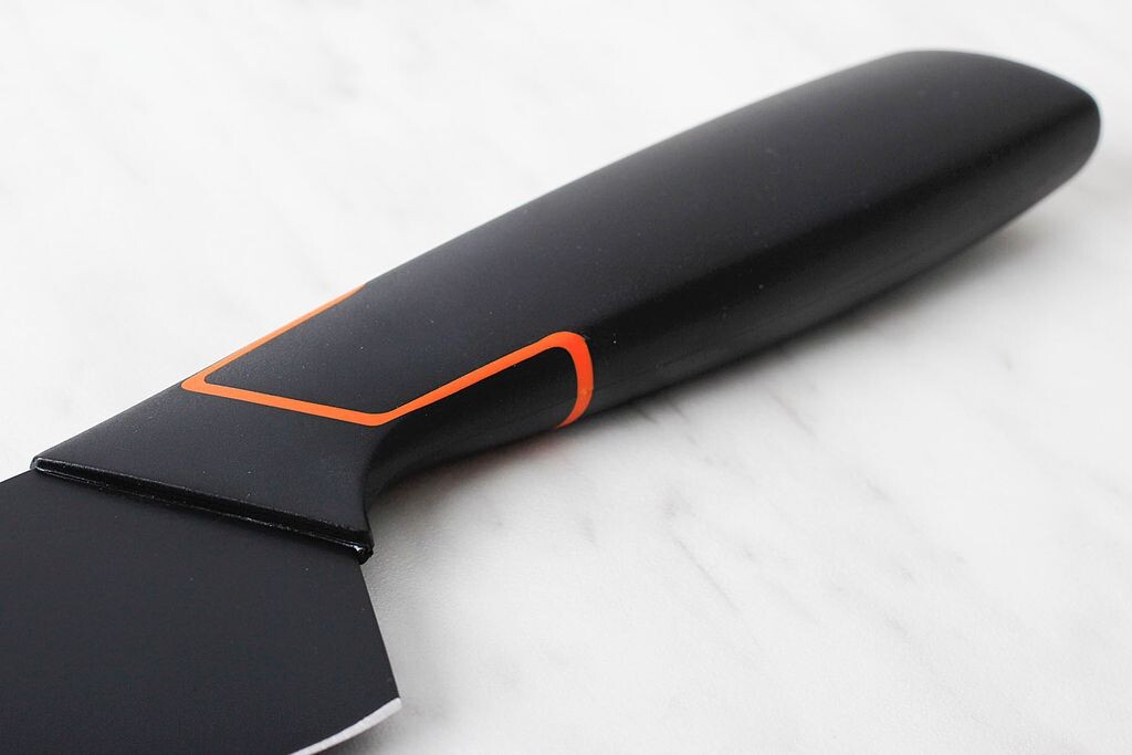 Эргономичная пластиковая ручка прочна, легко чистится и позволяет пользователю держать нож близко к лезвию для контроля. “