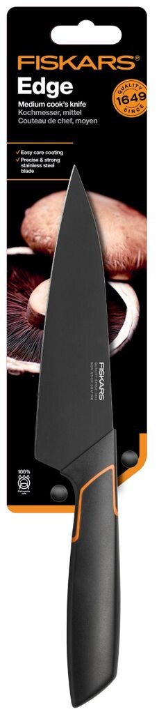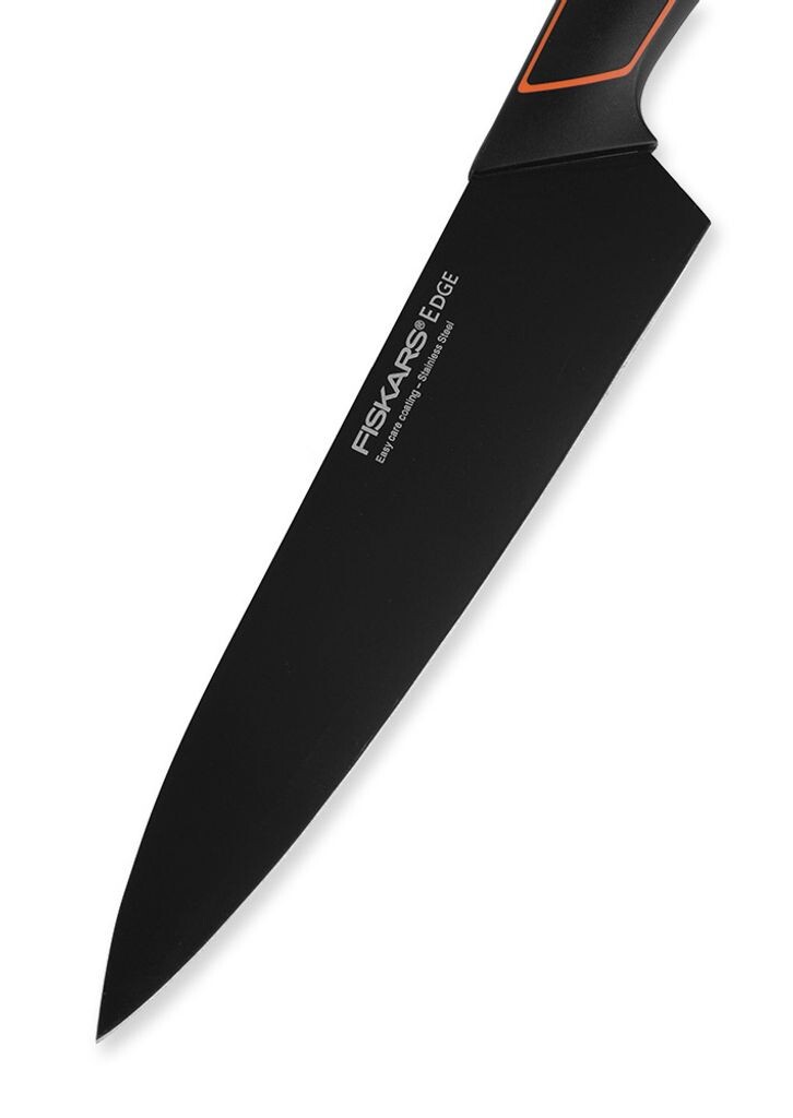 Edge Привлекательный черный вид и простота в уходеFiskars Edge имеет элегантный современный дизайн и инновационные функции. Особая поверхность не только придает ножам привлекательный черный вид, но и облегчает уход за ними. Универсальный помощник для нарезки мяса, овощей и зелени. Большой нож с высоким и толстым лезвием. Длина лезвия 19 см. Японская нержавеющая сталь (твердость: HRC 53). Можно мыть в посудомоечной машине