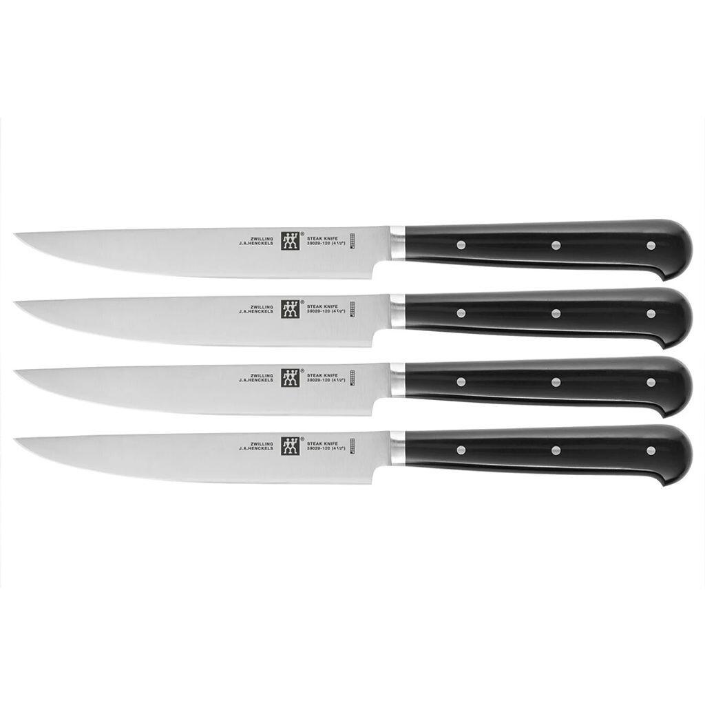 Набор ножей для стейка ZWILLING из 4 штук идеально подходит для любителей хорошего стейка. Он впечатляет не только высоким качеством материалов и остротой лезвий, которые позволяют легко проникать в мясо, но и дизайном, разработанным Маттео Туном и Антонио Родригесом. Лезвия ножей этого набора ZWILLING имеют длину 12 см и изготовлены из прочной и долговечной нержавеющей стали. Ручки изготовлены из акрилонитрил-бутадиен-стирола или АБС-пластика. Этот материал также очень прочен и устойчив к внешним воздействиям. Даже после многих лет использования ручки из АБС-пластика сохраняют свой эстетичный вид. Они немного шире на конце, что делает их более удобными и менее скользкими при резке. Рукоять и лезвие соединены тремя заклепками и придают набору ножей классический вид. который был популярен на протяжении многих лет и будет оставаться таковым в будущем.