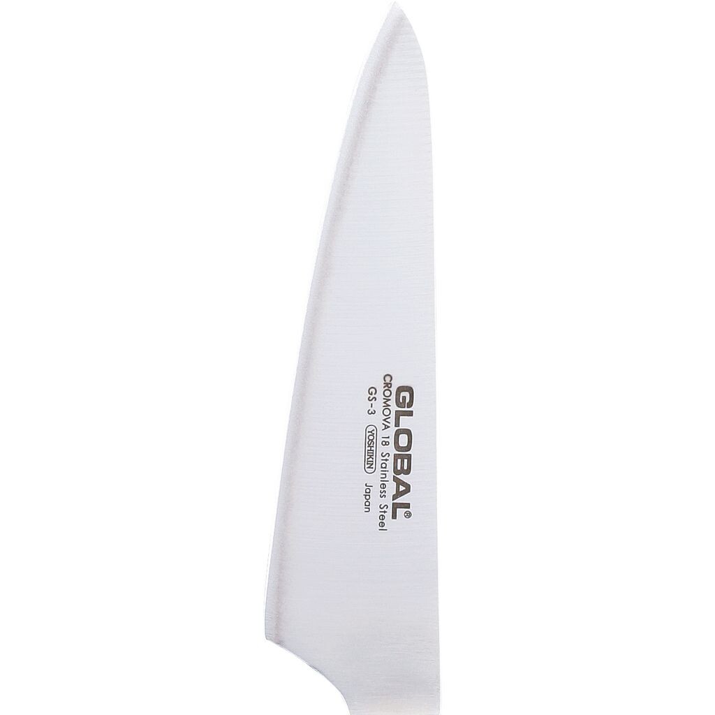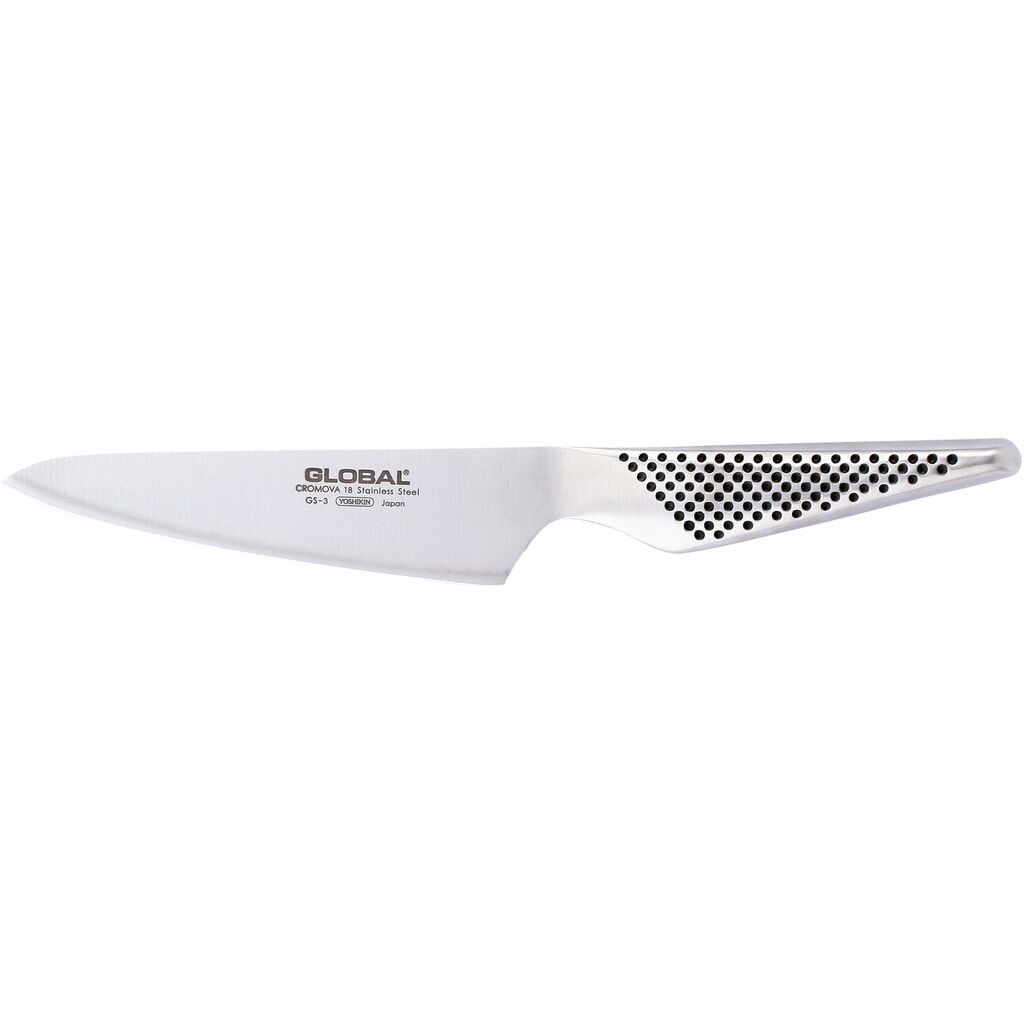 Маленький поварской нож GS-03 Global Yoshikin — универсальный нож для домашнего использования. Он имеет острое лезвие длиной 13 см. По сравнению с универсальными ножами, лезвие немного длиннее.
