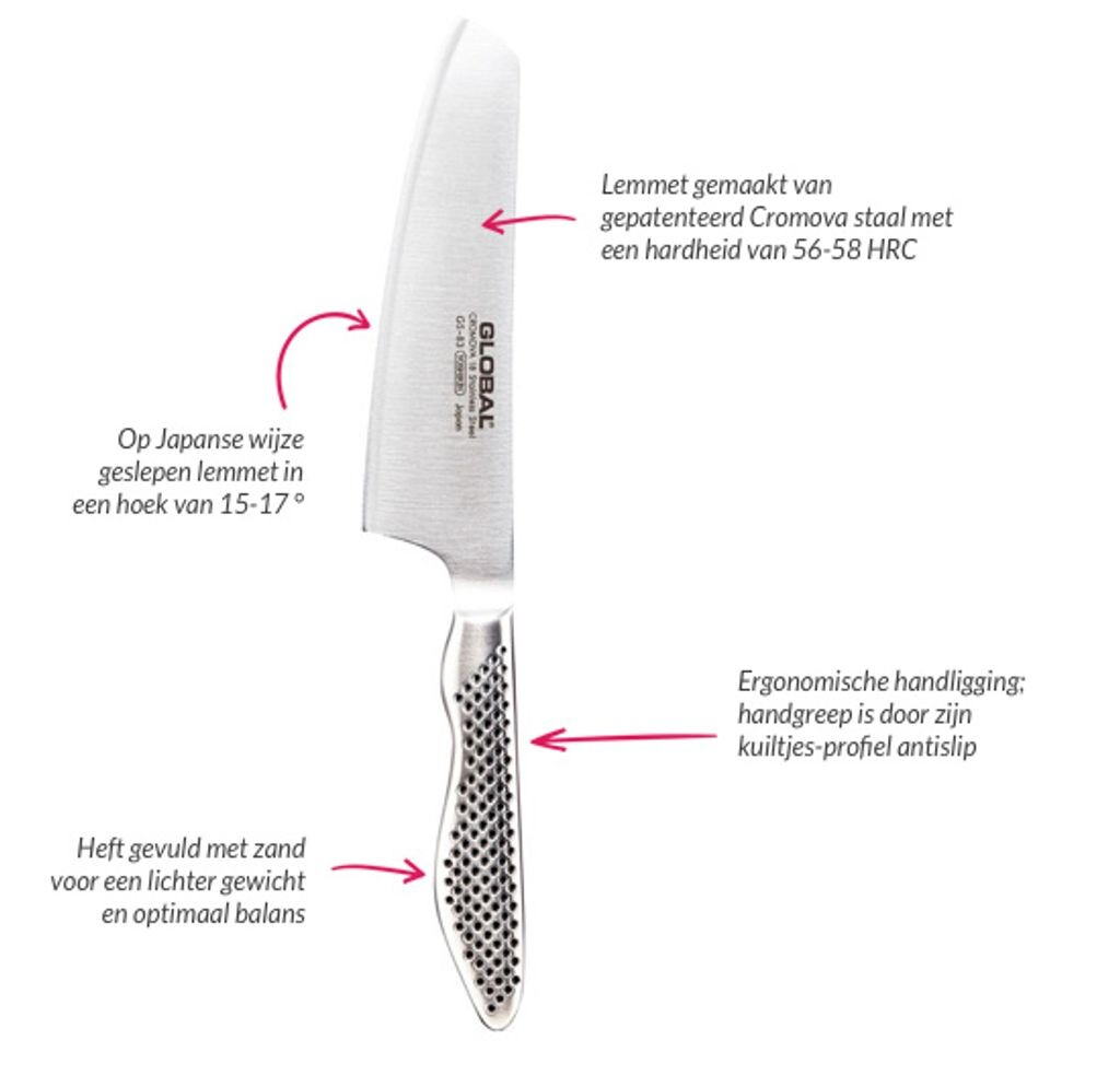 Каждый нож GLOBAL изготовлен из высококачественной молибден-ванадиевой стали и сохраняет режущую кромку исключительной остротой благодаря специальной закалке при температуре минус 56–58 °C и специальной японской заточке. Это обеспечивает точную и лёгкую нарезку продуктов и ингредиентов. Эргономичная рукоятка обеспечивает лёгкое ведение ножа и предотвращает его скольжение. Идеальная гигиеничность обеспечивается бесшовной рукояткой.