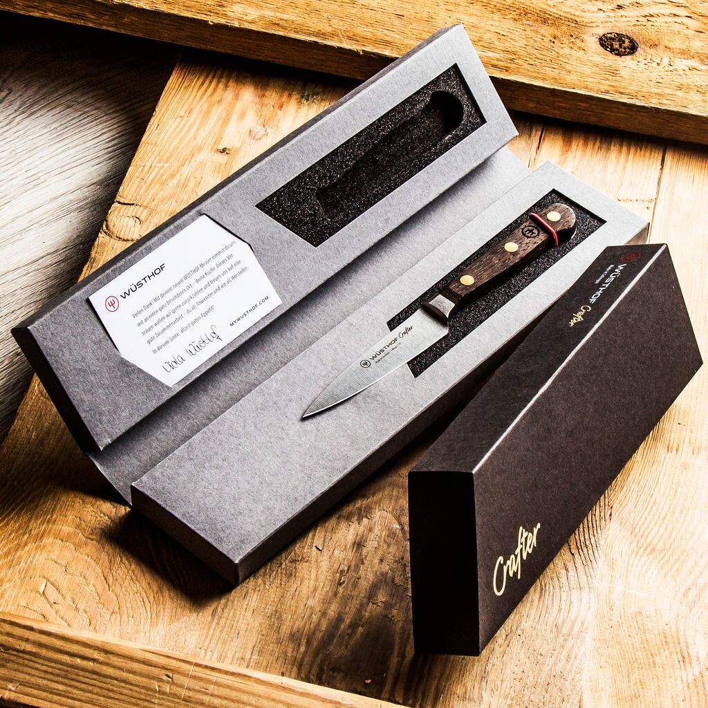 Как следует из названия Crafter, это прочный рабочий нож, созданный для индивидуальных поваров и динамичных производителей, которые не только аккуратно упаковывают вещи, но и имеют чувство вкуса. за стильную эстетику этих исключительно высококачественных ножей. Рукоятки из копченого дуба, надежная клепка из латуни, специально закаленная сталь для лезвия: серия Crafter — это дань традиции производства латуни в Вюстхофе, которая продолжается уже более двух столетий.