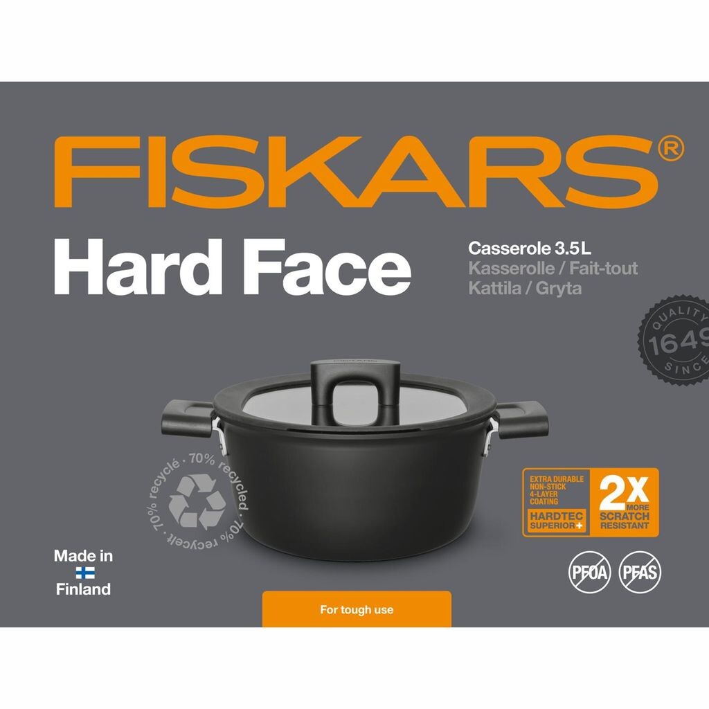 Для самых требовательных к ежедневной готовке рекомендуется широкий ассортимент Hard Face. Fiskars представляет новое поколение покрытия Hardtec Superior для новых моделей Hard Face из алюминия и нержавеющей стали.