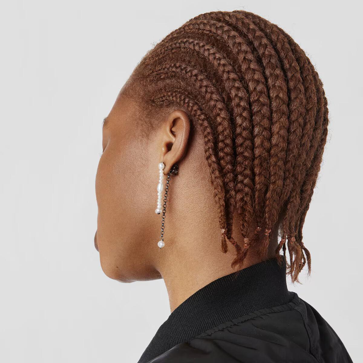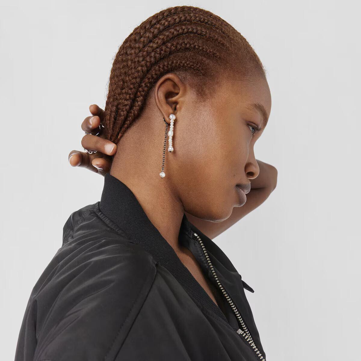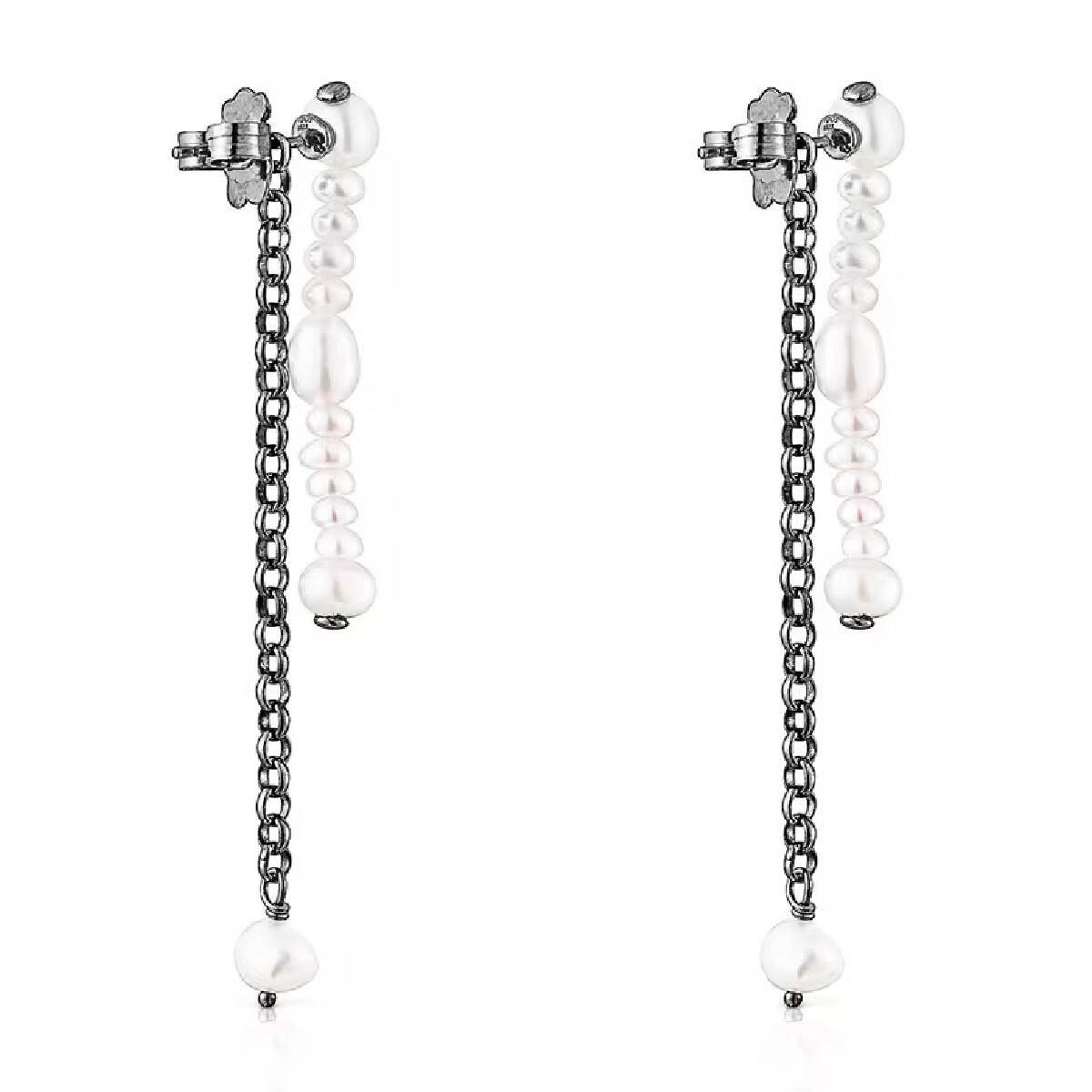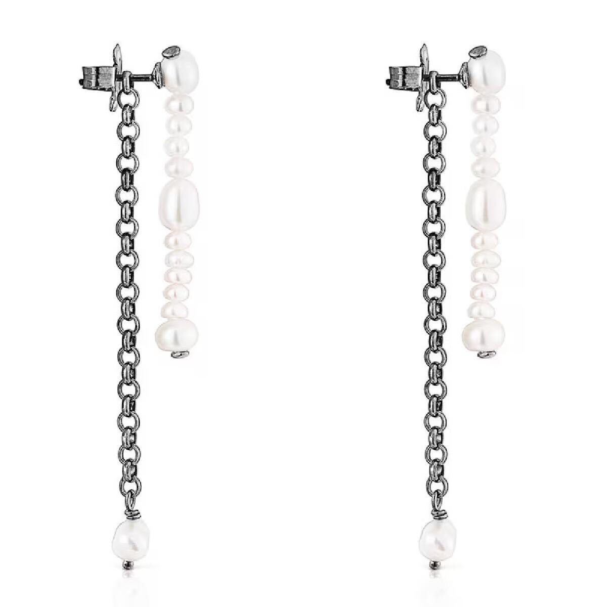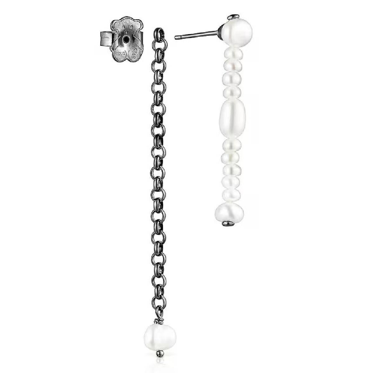 Двойные серьги виртуального сада TOUS с цепочкой из темного серебра и другой цепочкой из культивированного жемчуга разных размеров. Их можно использовать вместе или по отдельности.