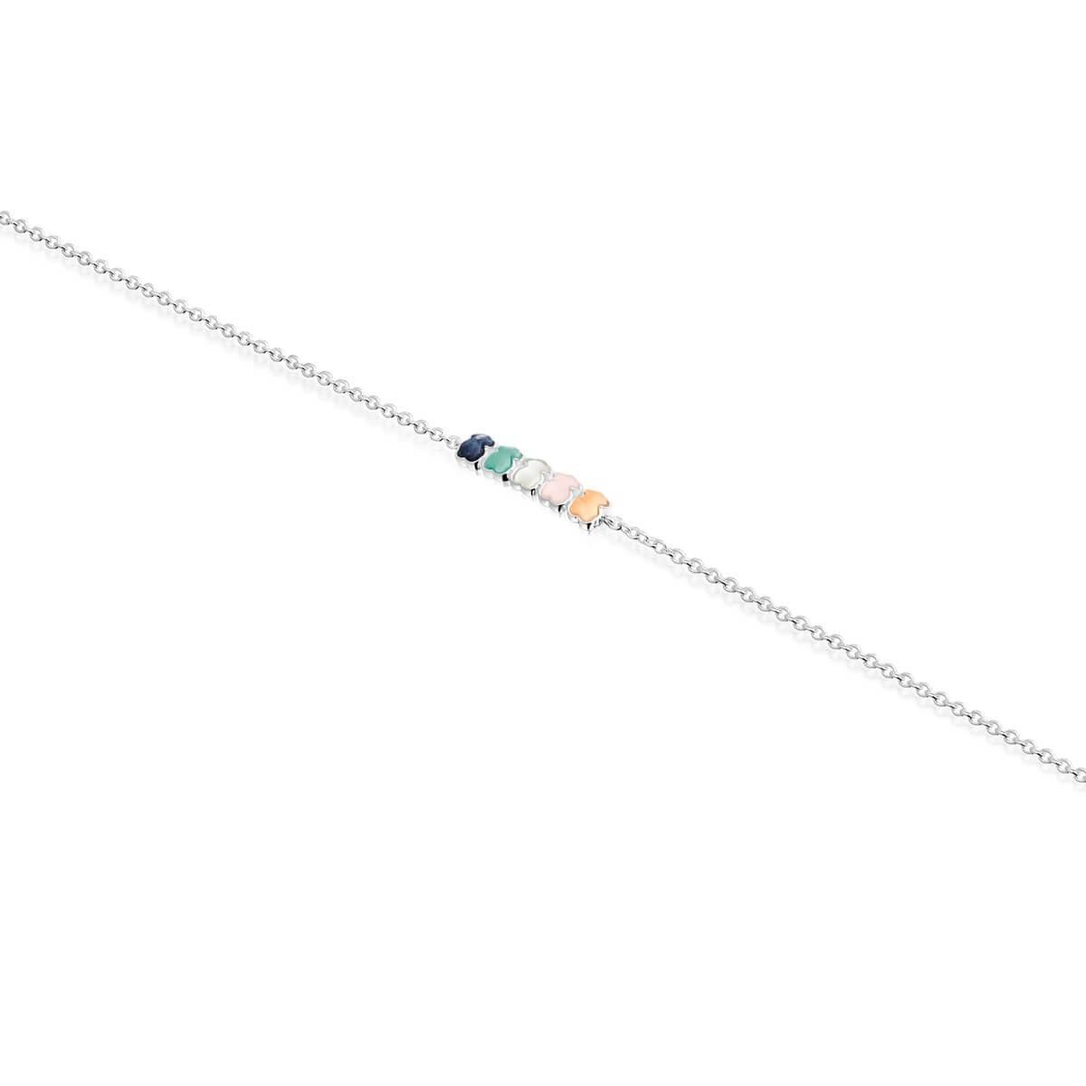 Серебро, драгоценные камни и нежное сочетание цветов для ваших самых нежных образов. Браслет TOUS Mini Color из стерлингового серебра с пятью кварцевыми медведями, с дюмортьеритом, амазонитом, перламутром и розовым и оранжевым кварцитом.