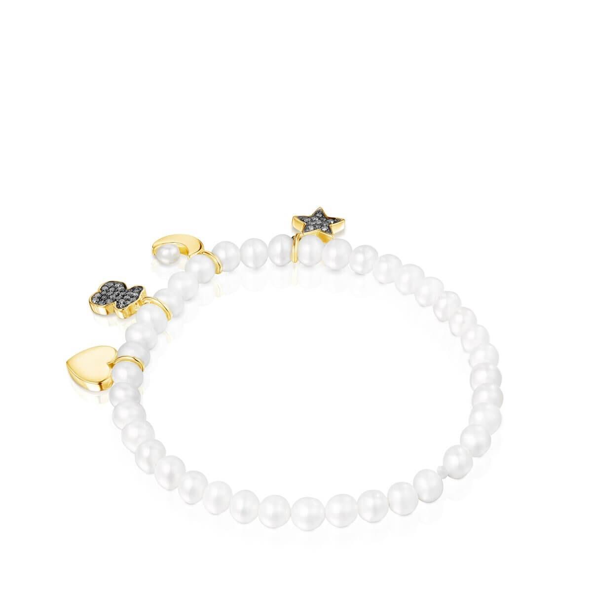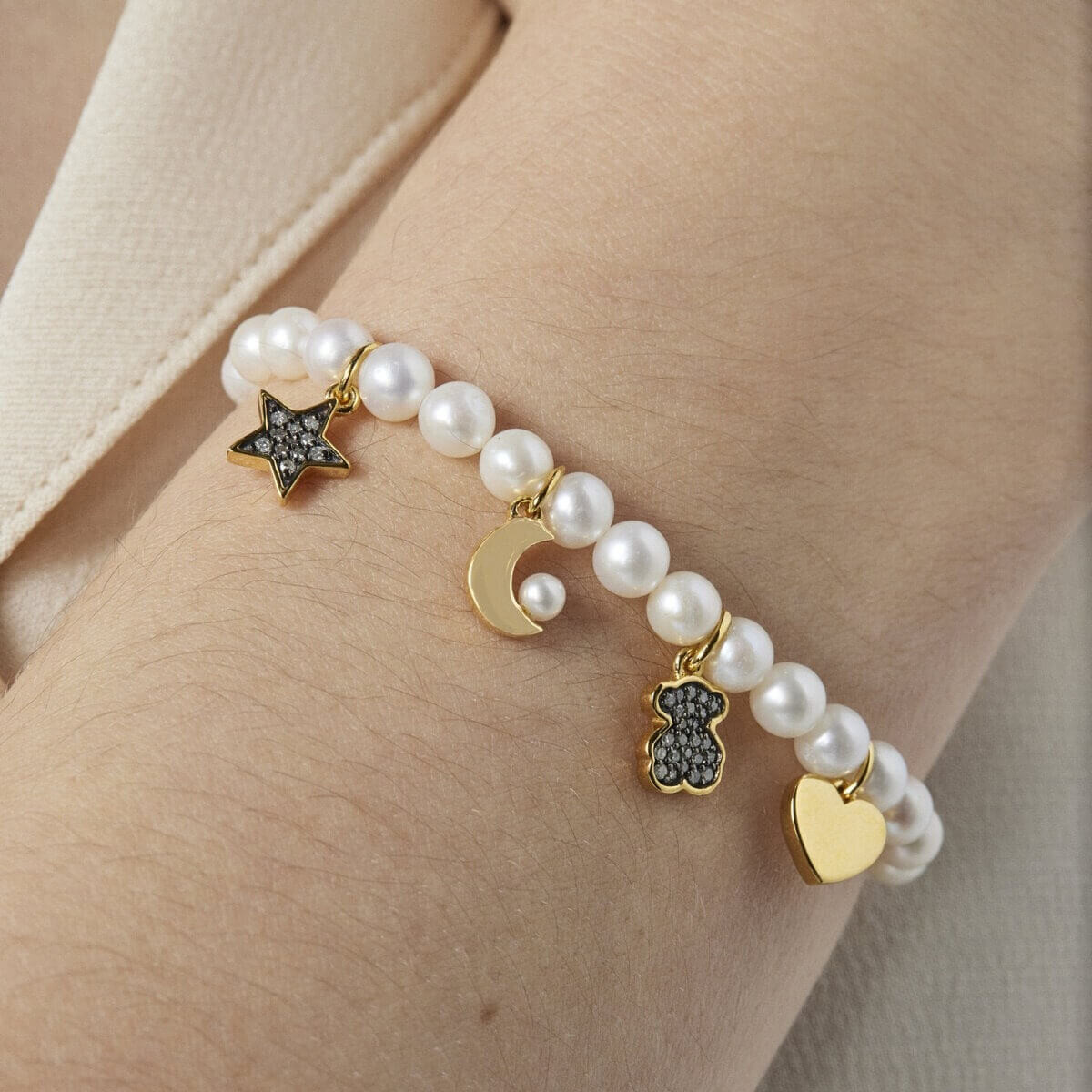 Свет, сияние и стиль. Ювелирные изделия из позолоченного золота и бриллиантового паве можно сочетать со всеми нашими иконами для создания магнетического, элегантного образа. Nocturne, прикосновение света, которое вам нужно. Эластичный браслет TOUS Nocturne с Ø3-3,5 мм. жемчужины с четырьмя подвесными мотивами из серебряного вермеля с разноцветными бриллиантами одинарной огранки 0,18 карата. Вермейль — это слой 18-каратного золота на стерлинговом серебре минимальной толщиной 2,5 микрона, без какого-либо другого материала между ними.
