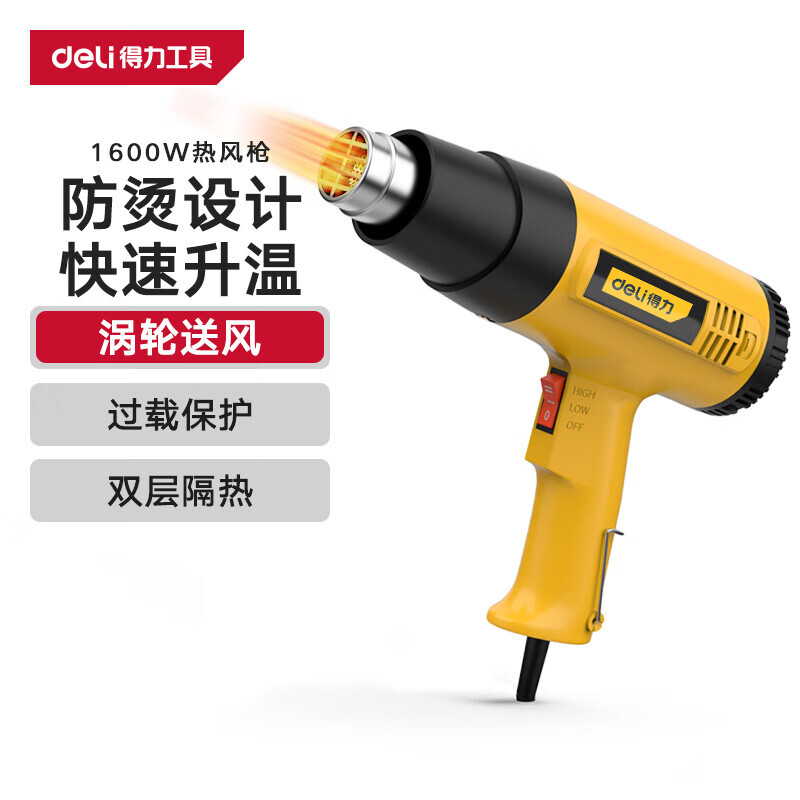 Пистолет горячего воздуха Deli, двухступенчатая регулировка температуры, электрический фен, автомобильный пистолет для выпечки пленки, пистолет для сушки термоусадочной пленки 1600 Вт