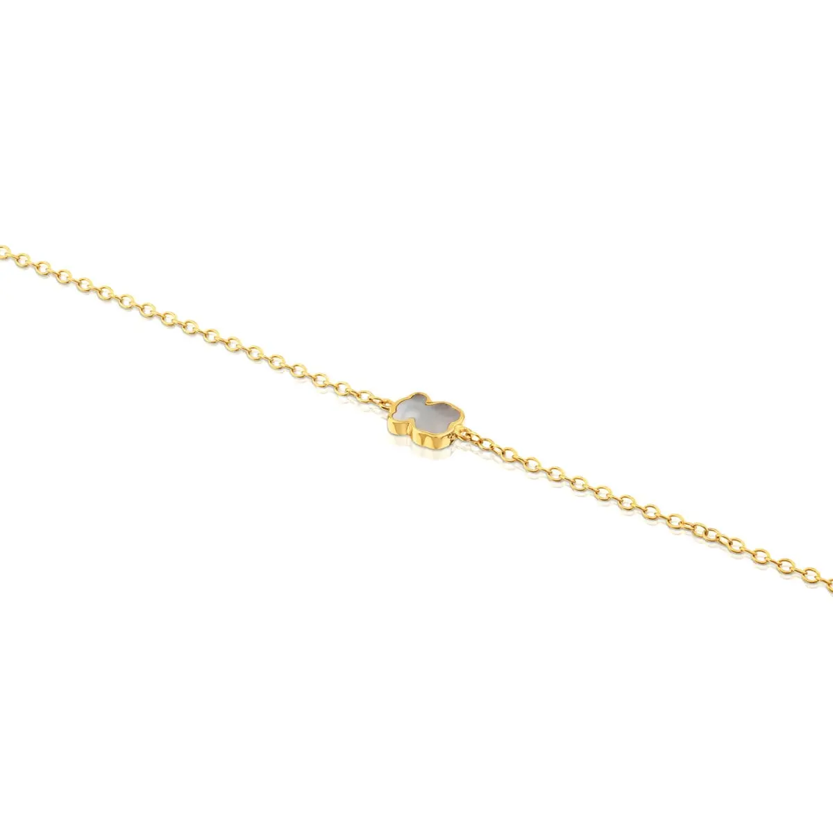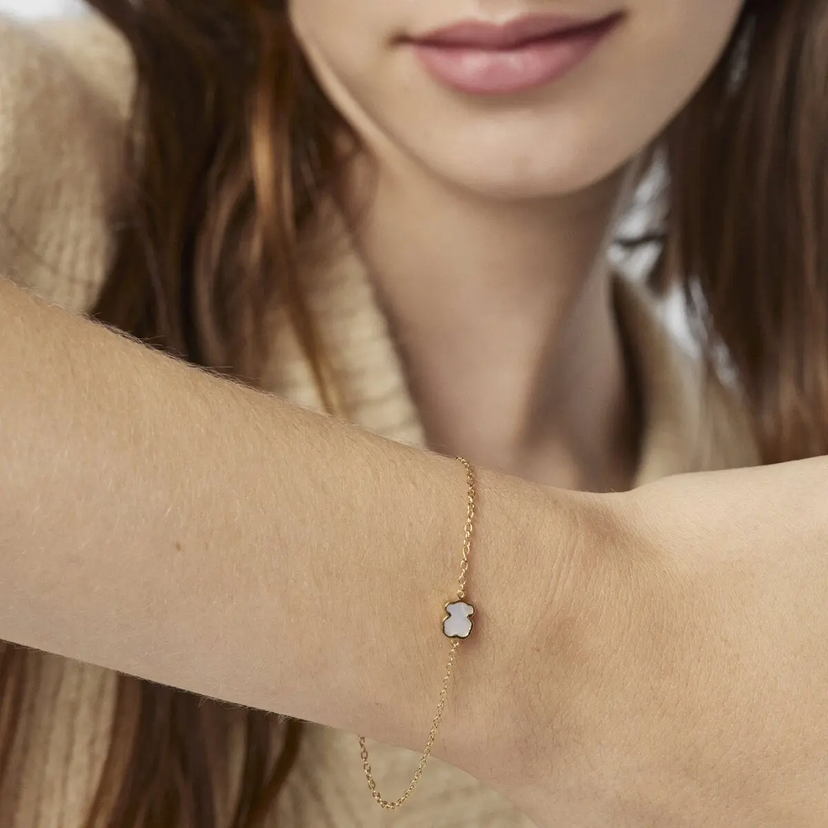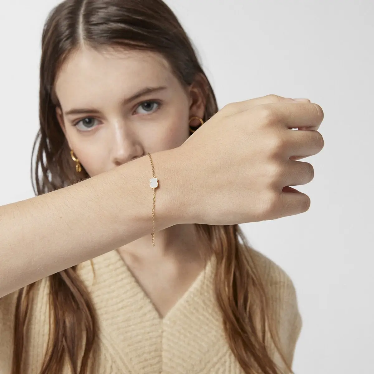 Значок бренда Tous отдает дань уважения особенному дню - первому причастию. Браслет с медвежонком Tous XXS из желтого золота 18 карат и перламутра.