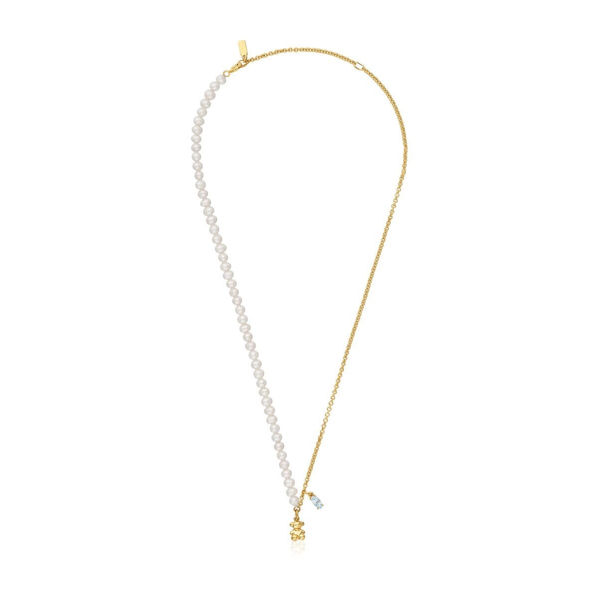 Короткое ожерелье TOUS Bold Bear с 18-каратным золотым покрытием поверх серебра, пресноводным культивированным жемчугом и граненым голубым овальным топазом.