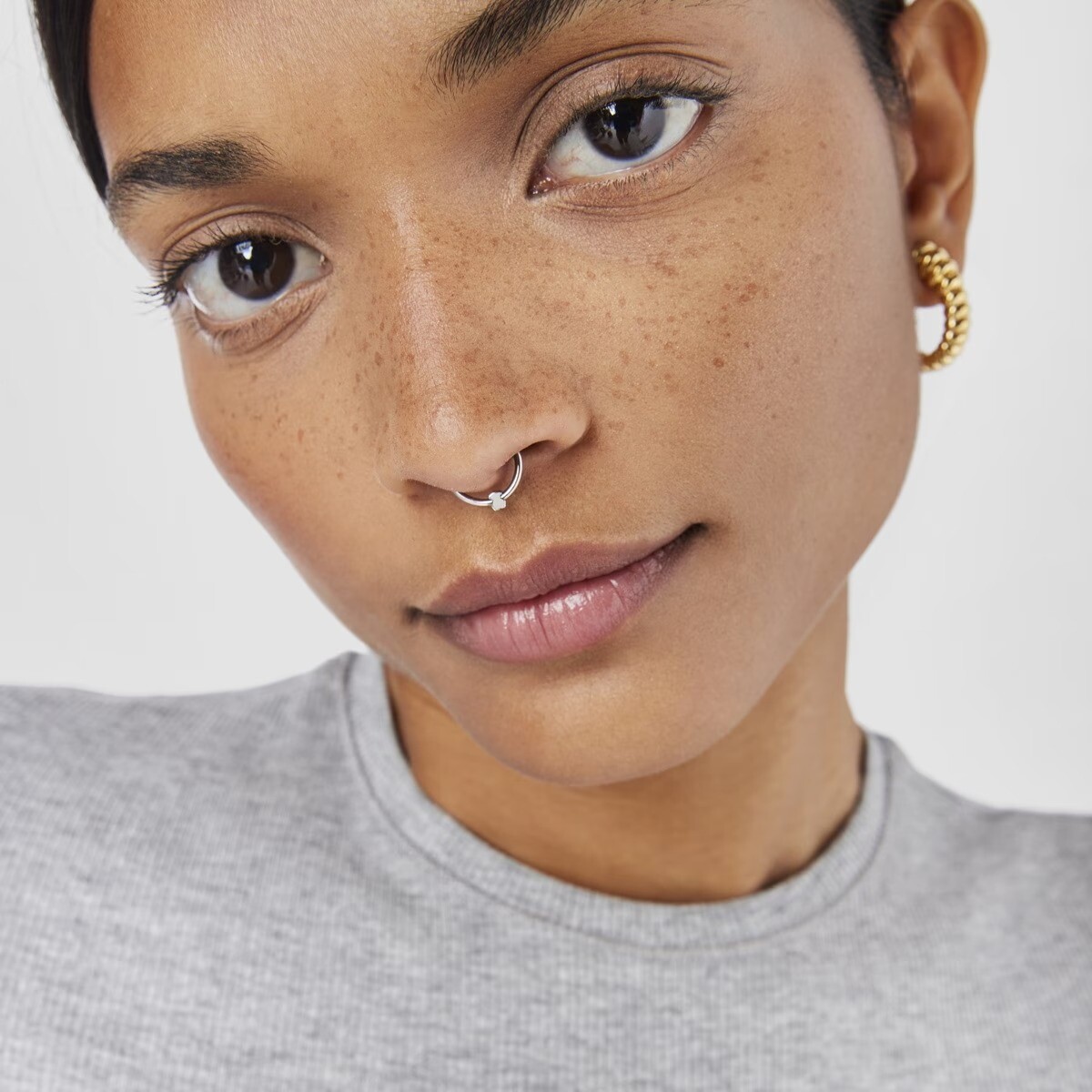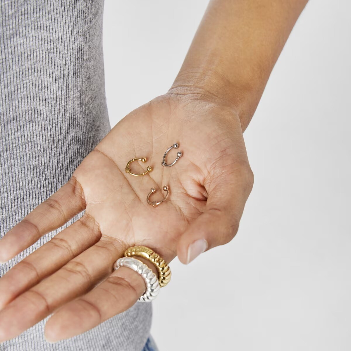 Набор из трех трехцветных перегородочных колец TOUS Basics из хирургической стали с медведем (сталь), звездой (золотистая IP-сталь) и сердцем (розовая IP-сталь).