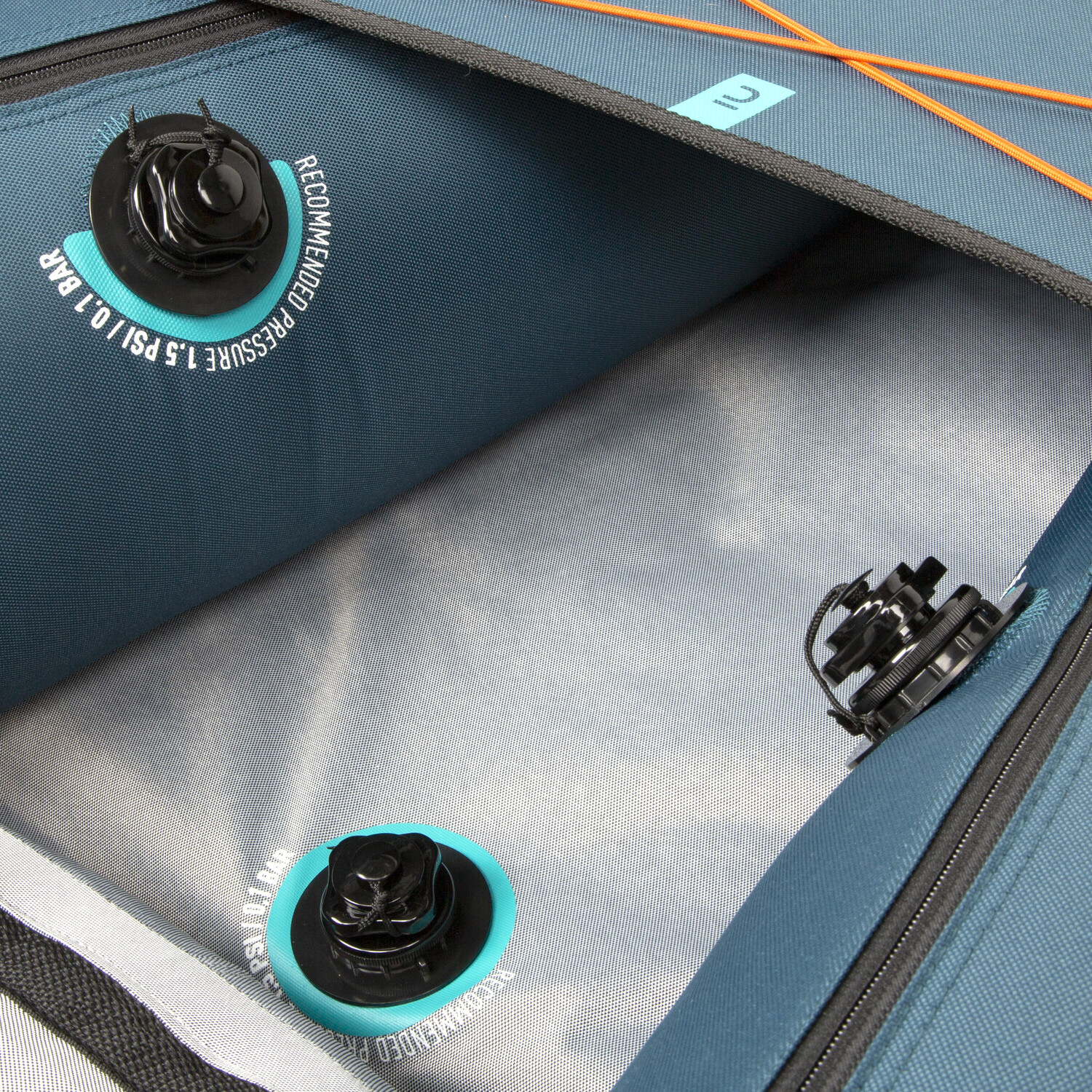 Надуйте пол, затем одну из боковых трубок, затем вторую на 50%. Проверьте общее расположение камер. Затем полностью надуйте его, не превышая давления 0,1 бар (1,5 фунта на квадратный дюйм).