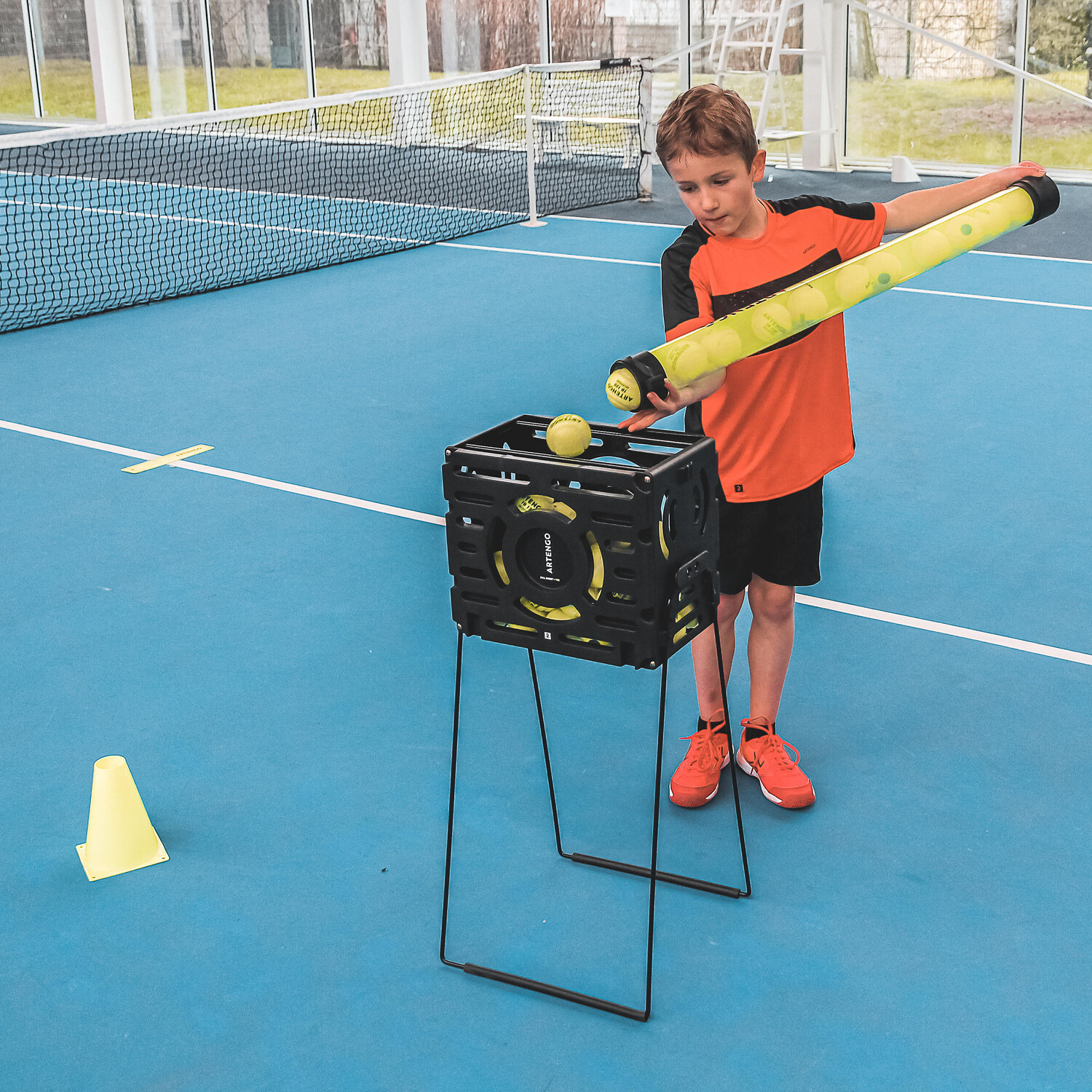 Этот практичный контейнер для мячей позволяет легко переносить и распределять как минимум 60 теннисных мячей во время тренировки.