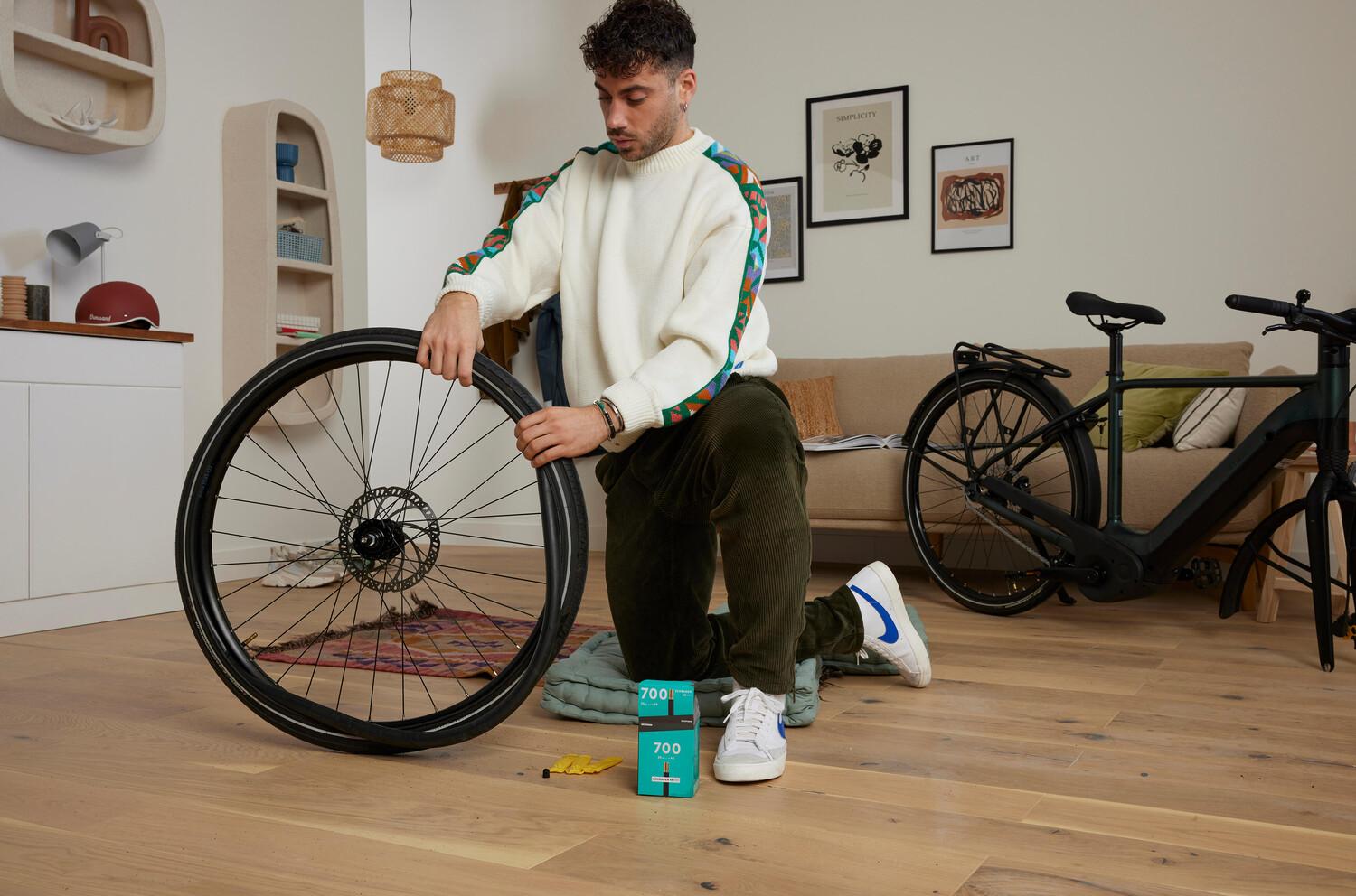 Предварительно слегка надуйте внутреннюю трубку, чтобы избежать защемления.