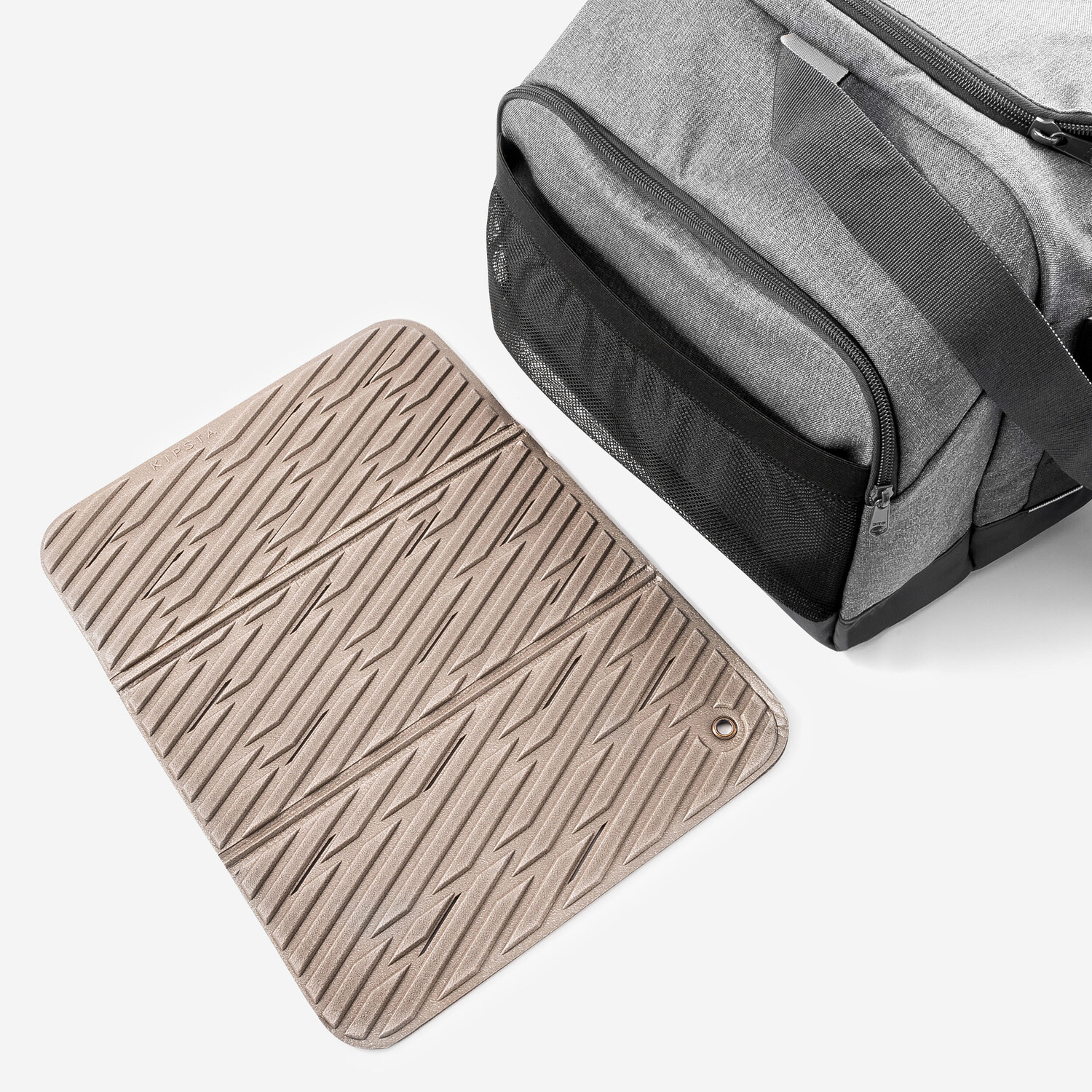 Чтобы переодеваться, не беспокоясь о том, что испачкаете ноги, мы добавили коврик из пенопласта для изоляции от грязного или мокрого пола. Этот коврик является съемным. Плечевой ремень изготовлен из пенопласта и имеет клейкие ленты, предотвращающие скольжение при переноске.