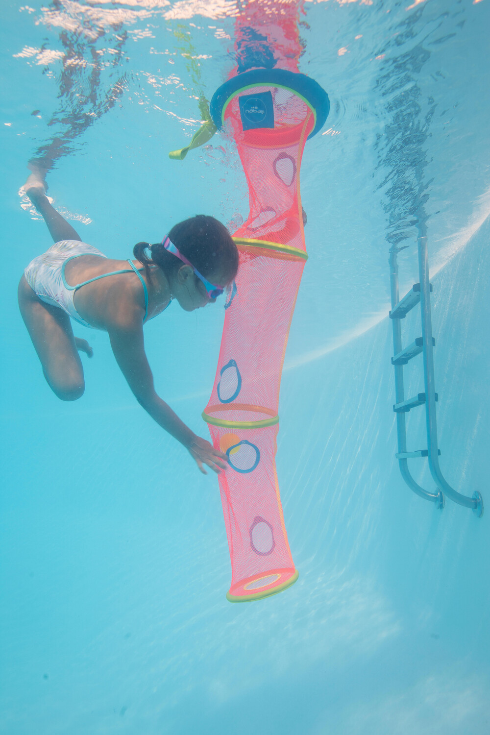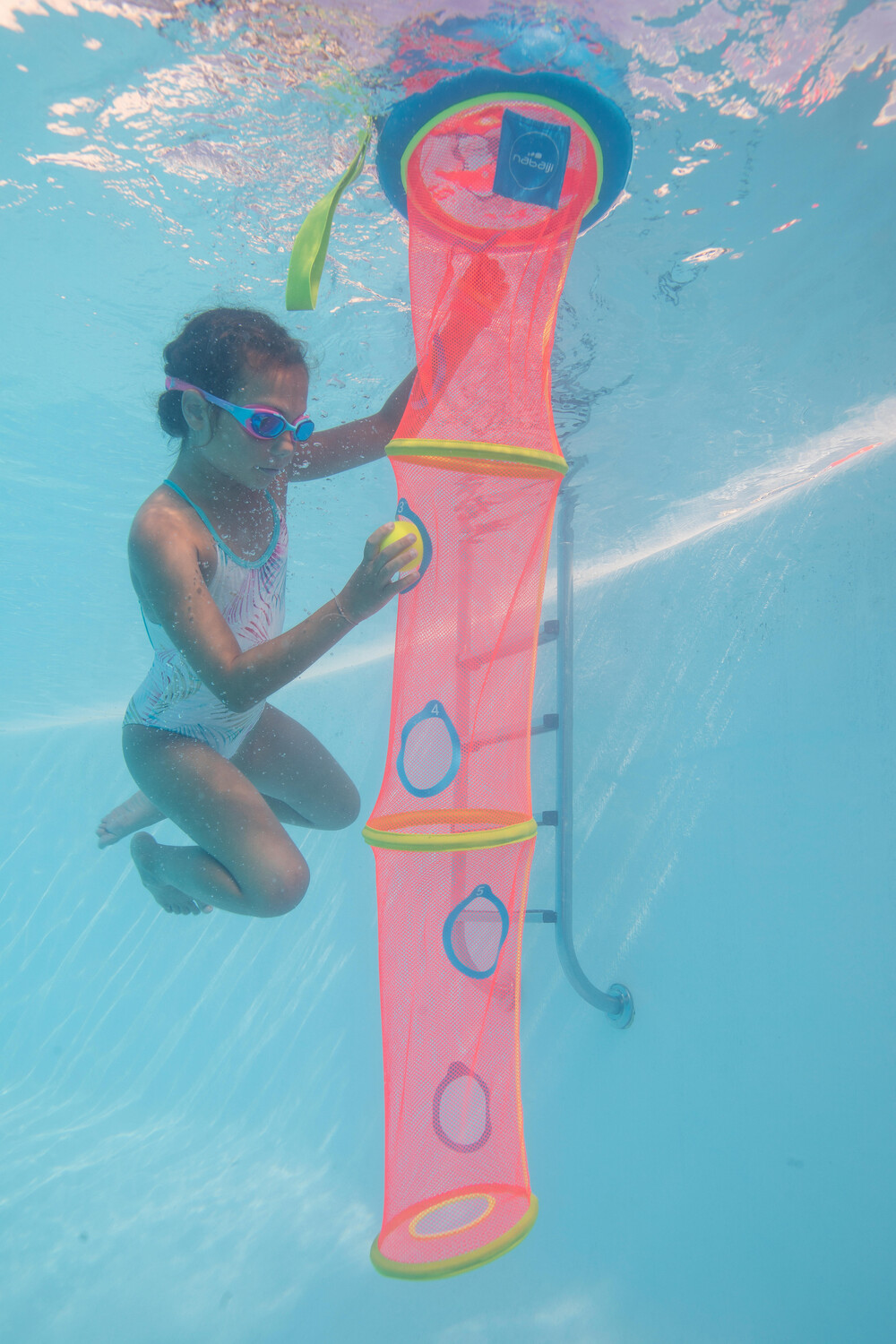 Малыш должен попасть мячом в первую мишень и вернуться на поверхность. Затем они возвращаются под воду, чтобы поместить его во второй, и так далее, вплоть до самой глубокой цели, которой они могут достичь.