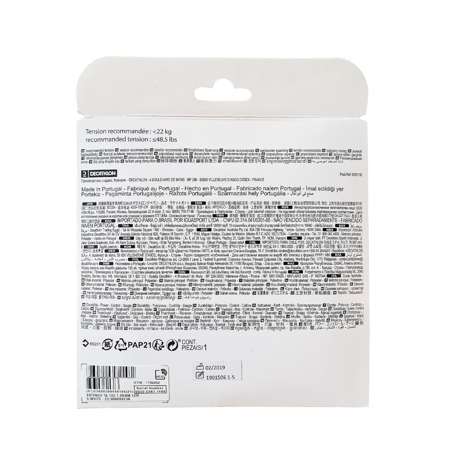 Для монофильных струн Decathlon рекомендует натяжение от 19 до 22 кг. Во избежание травм мы настоятельно не рекомендуем детям до 15 лет использовать мононити. Эти струны лучше всего подходят для игроков, у которых струны рвутся менее чем за 10 часов игры, поскольку они быстро теряют натяжение.
