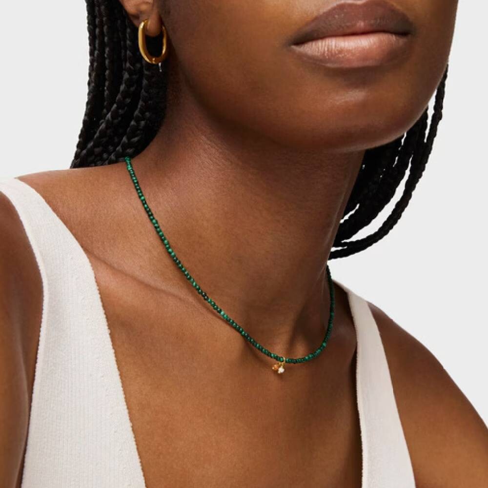 Ожерелье TOUS Camille с покрытием из 18-каратного золота поверх серебра и гладкими малахитовыми шариками. Изделие выполнено из стерлингового серебра с покрытием из 18-23-каратного золота и имеет толщину 3 микрона. Это качество гарантирует большую долговечность украшения.
