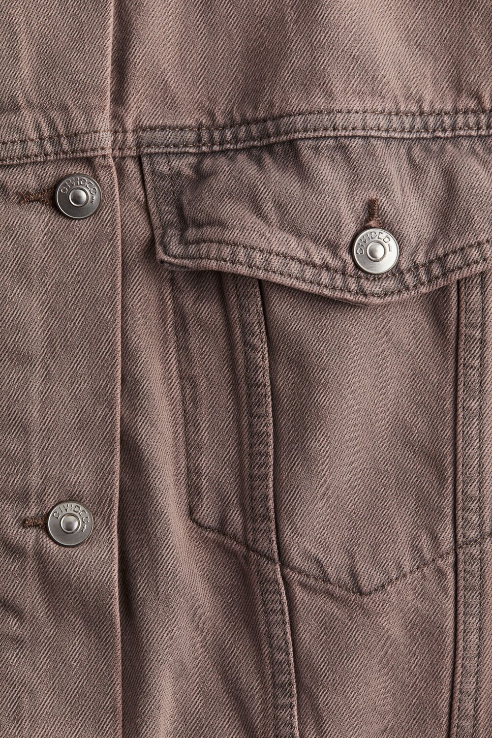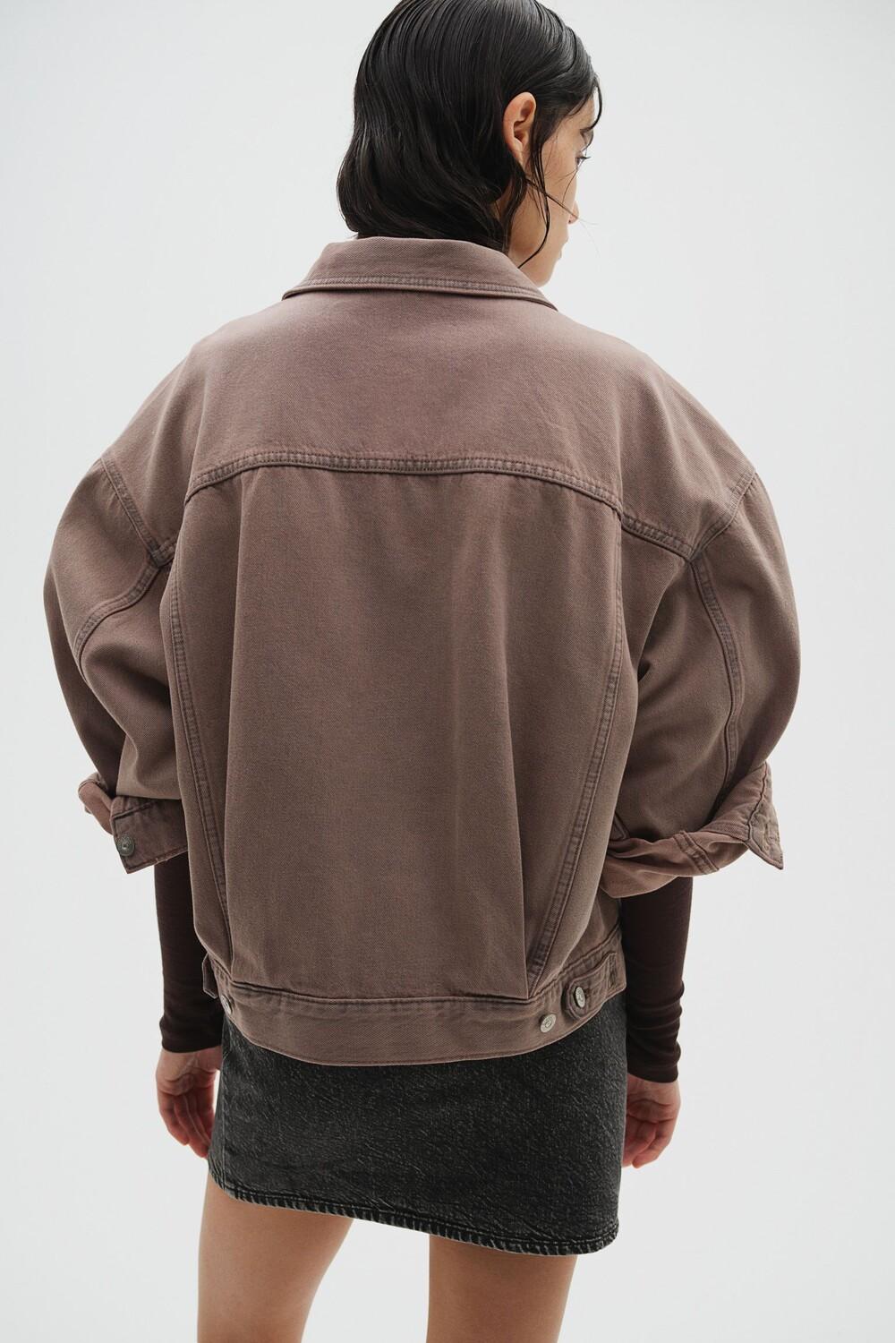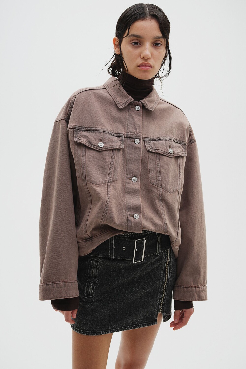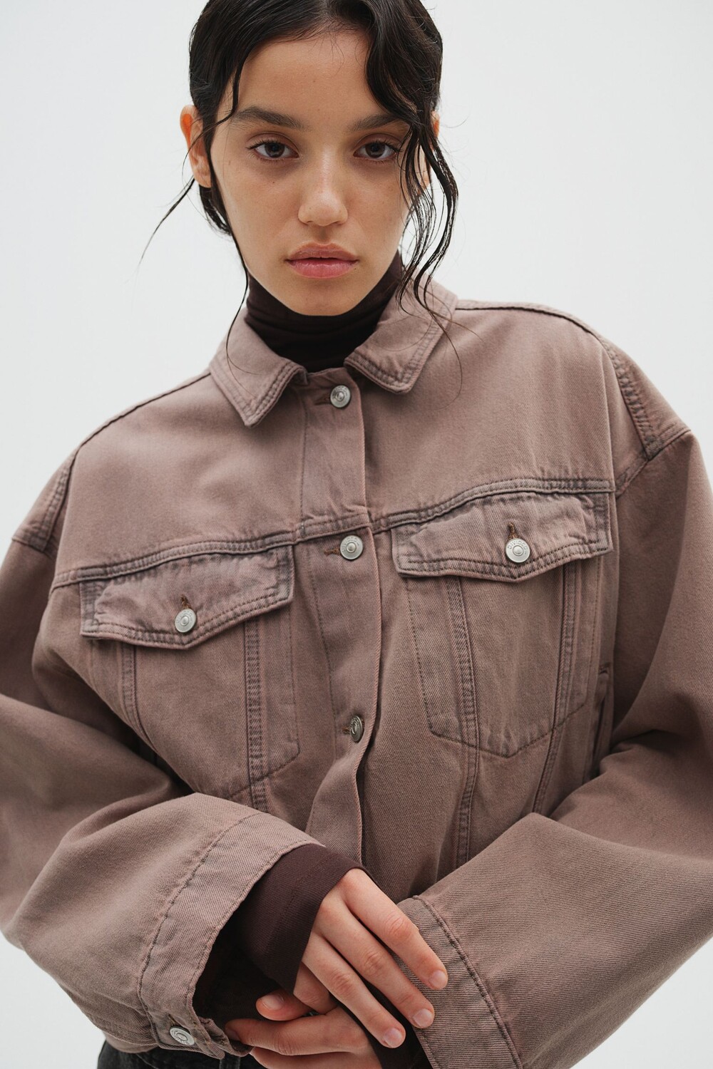 Куртка из плотного хлопкового денима. Отложной воротник, застежка на металлические пуговицы, плечевые швы сдвинуты вперед, кокетка спереди и сзади. Свободная посадка. Заниженная линия плеча, манжеты на пуговицах, нагрудные карманы с клапаном и пуговицей. Регулируемый язычок с кнопкой внизу по бокам.
