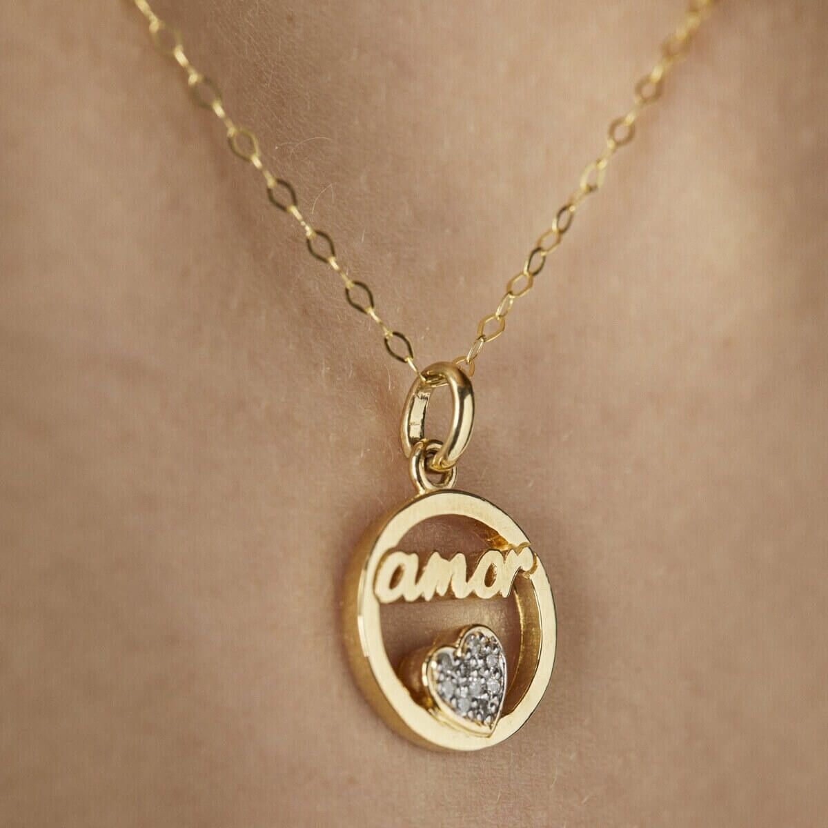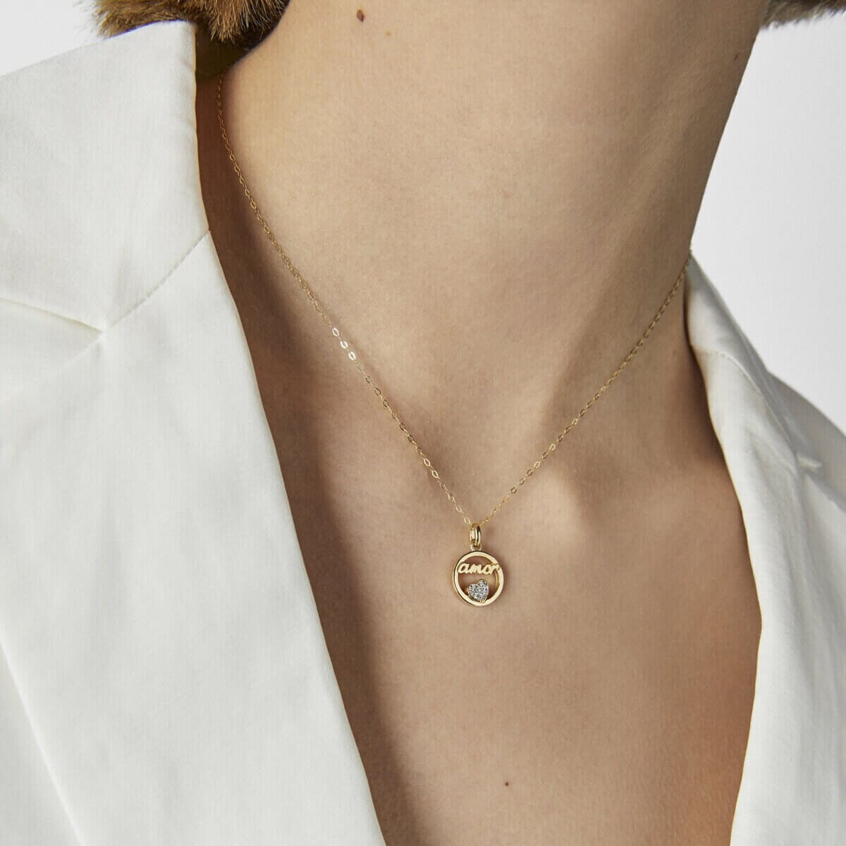 Подвеска TOUS в виде слова "Amor" из желтого золота 18 карат с сердечком из бриллиантов бриллиантовой огранки H/SI в 0,036 карата. Размер медальона: 12 мм. Цепочка в комплект не входит.