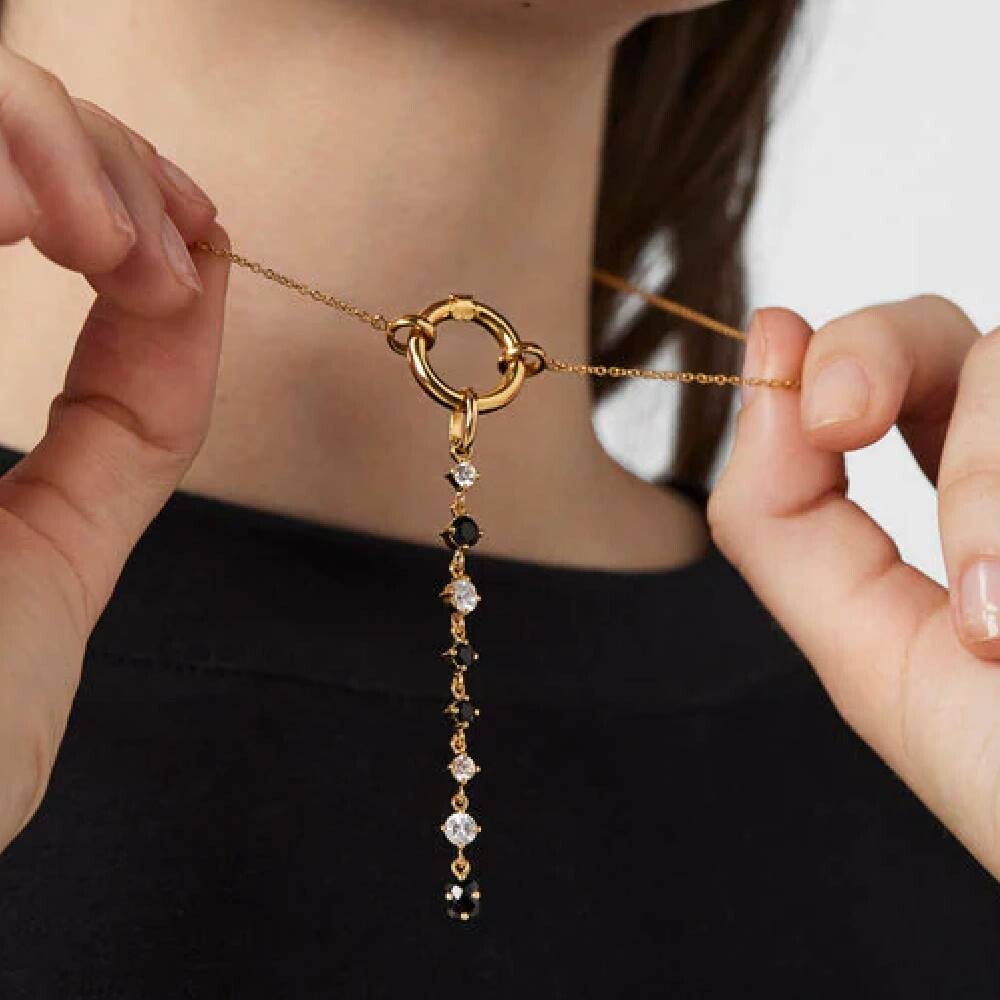 Подвеска TOUS Glaring из серебряного вермеля с четырьмя ониксами 3-4 мм и четырьмя циркониями 3-4 мм. Стерлинговое серебро, покрытое 18-каратным золотом толщиной от 3 до 5 микрон, без других металлов между ними.