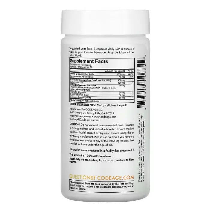 Высокая доза 1500 мг витамина С, цинка, биофлавоноидов цитрусовых с порошками грейпфрута, лимона и апельсина. Содержит порошок бузины, кверцетин и экстракты плодов шиповника.