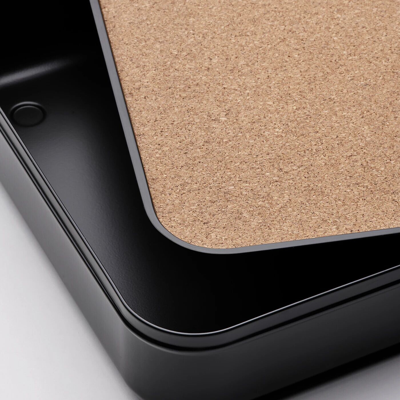 Прочная металлическая коробка с пробковой крышкой, которая позволяет легко ставить несколько коробок друг на друга, не царапая их.
