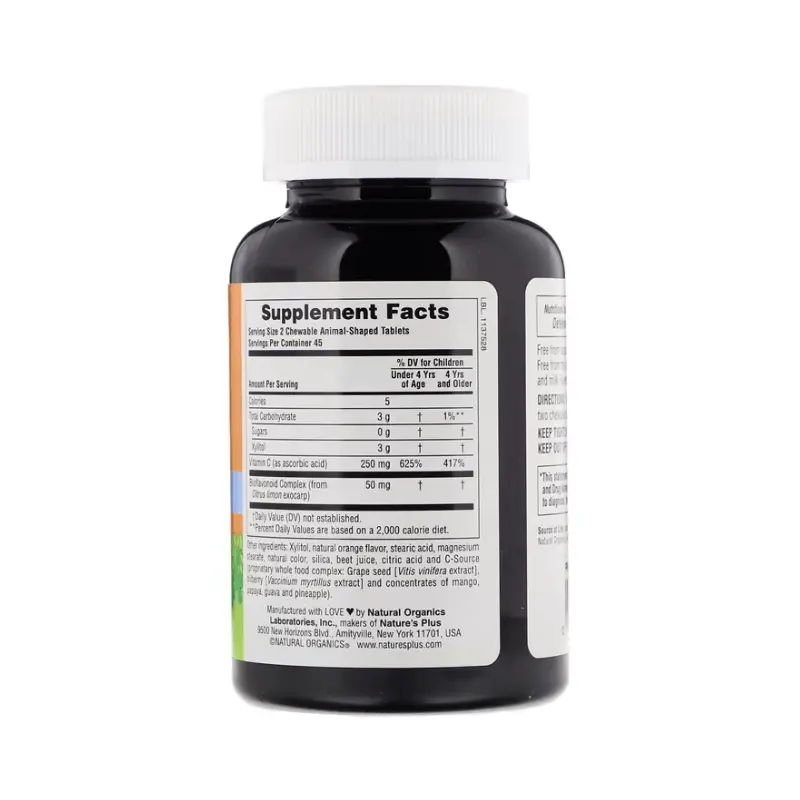 Витамин С (в виде аскорбиновой кислоты), ксилитол, натуральный ароматизатор «апельсин», стеариновая кислота, стеарат магния, натуральный краситель, диоксид кремния, сок свеклы, лимонная кислота и C-Source (запатентованный комплекс цельных продуктов: экстракт виноградных косточек [vitis vinifera], экстракт черники [vaccinium myrtillus] и концентраты манго, папайи, гуавы и ананаса).