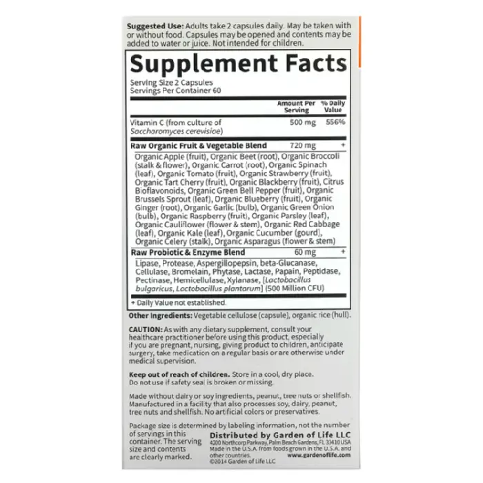 Витамин С (из пекарских дрожжей [Saccharomyces cerevisiae]), смесь органических необработанных фруктов и овощей, смесь необработанных пробиотиков и ферментов