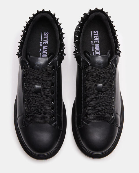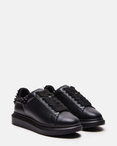 Широкая массивная подошва служит основой монохромных кроссовок на плоской платформе FROSTING. Гладкий верх дополнен конусообразными шипами на воротнике на щиколотке.
