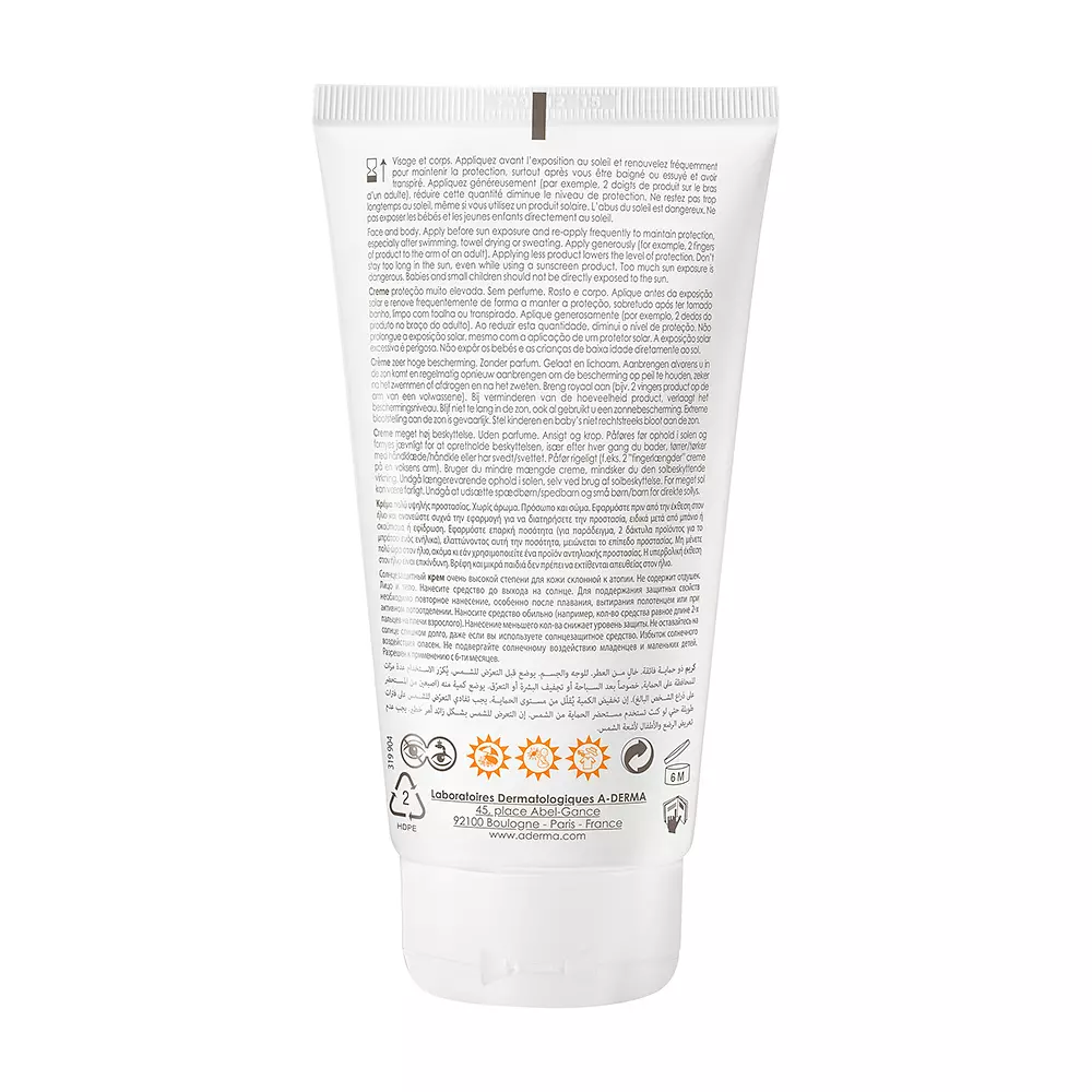 Защитный солнцезащитный крем PROTECT AD SPF50+ от A-DERMA. Этот солнцезащитный крем с очень высокой степенью защиты SPF 50+ предназначен для хрупкой, чувствительной, сухой и склонной к атопии кожи и предлагает 3 уровня действия. Запатентованная инновация , ставшая результатом 7-летних исследований, барристолид, полученный из масла овса Rhealba, укрепляет кожный барьер и помогает защитить клеточную ДНК кожи от воздействия UVA-лучей. Этот мощный и инновационный активный ингредиент поддерживается запатентованной фотозащитной системой , обеспечивающей оптимальную защиту хрупкой, сухой и склонной к атопии кожи. Этот солнцезащитный крем с SPF 50+ не содержит отдушек и обладает очень высокой степенью защиты. Он имеет кремовую текстуру и легко наносится на лицо и тело. Нелипкая и водостойкая текстура. • ЗАЩИЩАЕТ: кожу благодаря широкому спектру защиты (коротковолновые и длинноволновые лучи UVA и UVB), фотостабильности и водостойкости. Солнцезащитный крем без запаха, созданный в результате тщательного выбора фильтров и ингредиентов, обеспечивает оптимальную толерантность к хрупкой, сухой и склонной к атопии коже. • УКРЕПЛЯЕТ: естественный барьерный эффект кожи. • СОХРАНЯЕТ: клеточную ДНК от УФА-излучения. лучи благодаря барристолиду с антиоксидантными свойствами, которые улучшают клеточную детоксикацию . Информация для веганов: никаких ингредиентов животного происхождения.